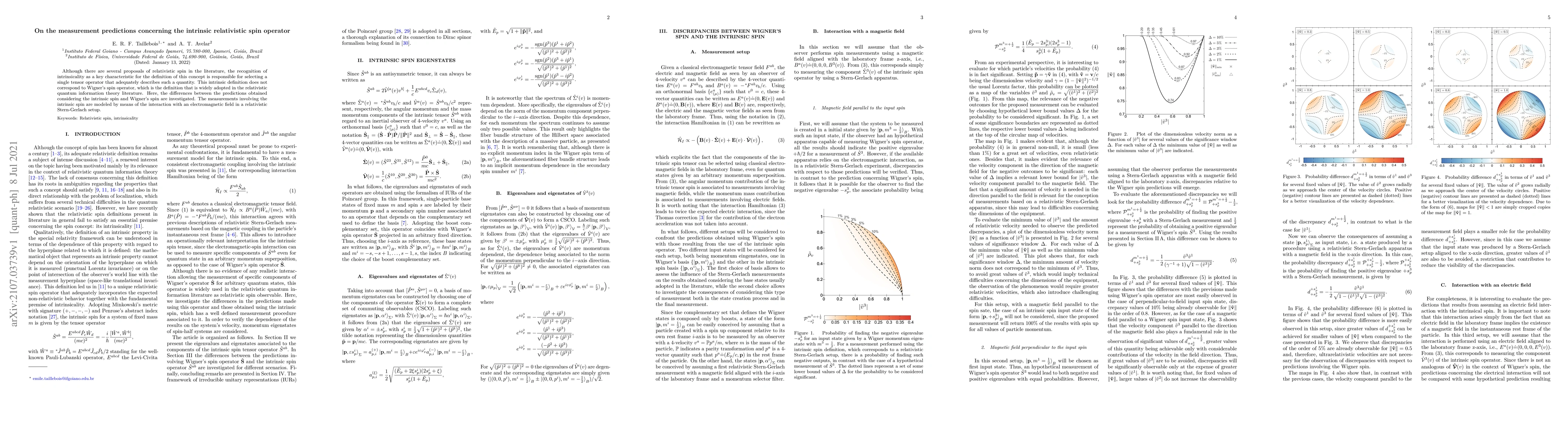 A study investigates differences in predictions for measuring intrinsic relativistic spin versus Wigner's widely adopted definition in a relativistic Stern-Gerlach setup with electromagnetic field interactions.