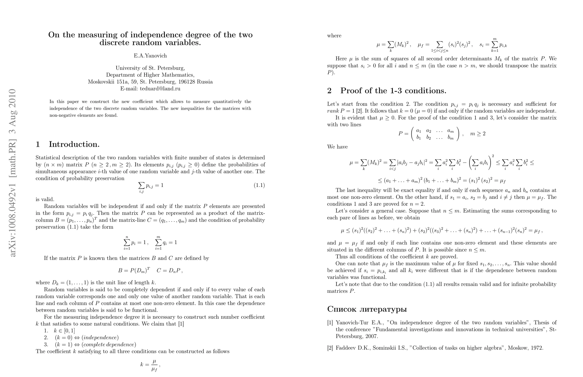 In this paper we construct the new coefficient which allows to measure quantitatively the independence of the two discrete random variables. The new inequalities for the matrices with non-negative elements are found