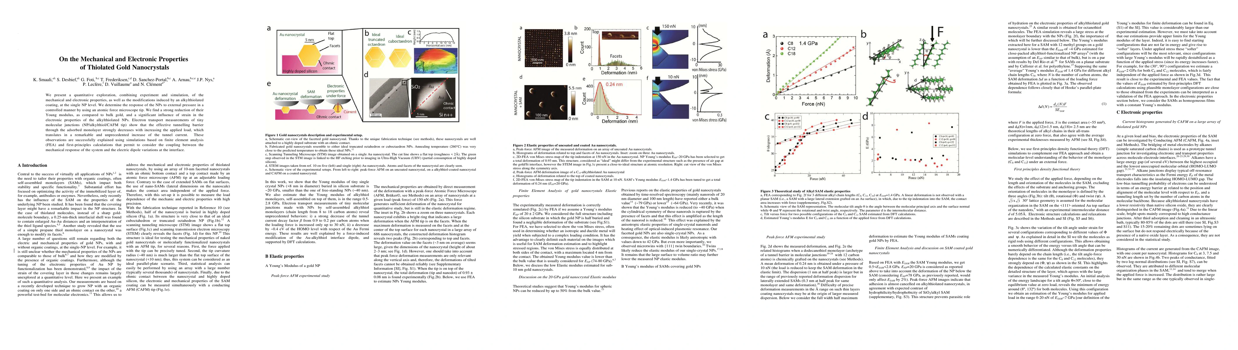 Researchers explore the mechanical and electronic properties of thiolated gold nanocrystals using a combination of experiments and simulations, revealing a strong reduction in Young's modulus and significant influence of strain on electronic properties.