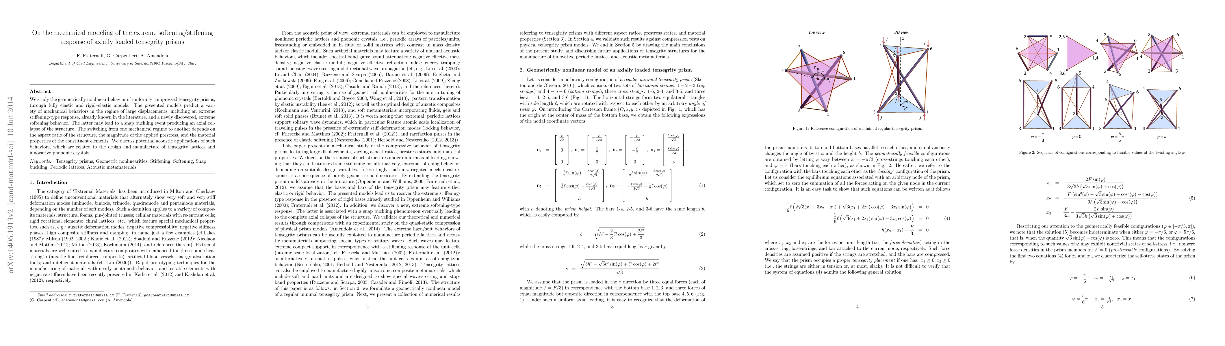 We study the geometrically nonlinear behavior of uniformly compressed tensegrity prisms, through fully elastic and rigid--elastic models. The presented models predict a variety of mechanical behaviors in the regime of large displacements, including an extreme stiffening-type response, already known in the literature, and a newly discovered, extreme softening behavior. The latter may lead to a snap buckling event producing an axial collapse of the structure. The switching from one mechanical regime to another depends on the aspect ratio of the structure, the magnitude of the applied prestress, and the material properties of the constituent elements. We discuss potential acoustic applications of such behaviors, which are related to the design and manufacture of tensegrity lattices and innovative phononic crystals.
