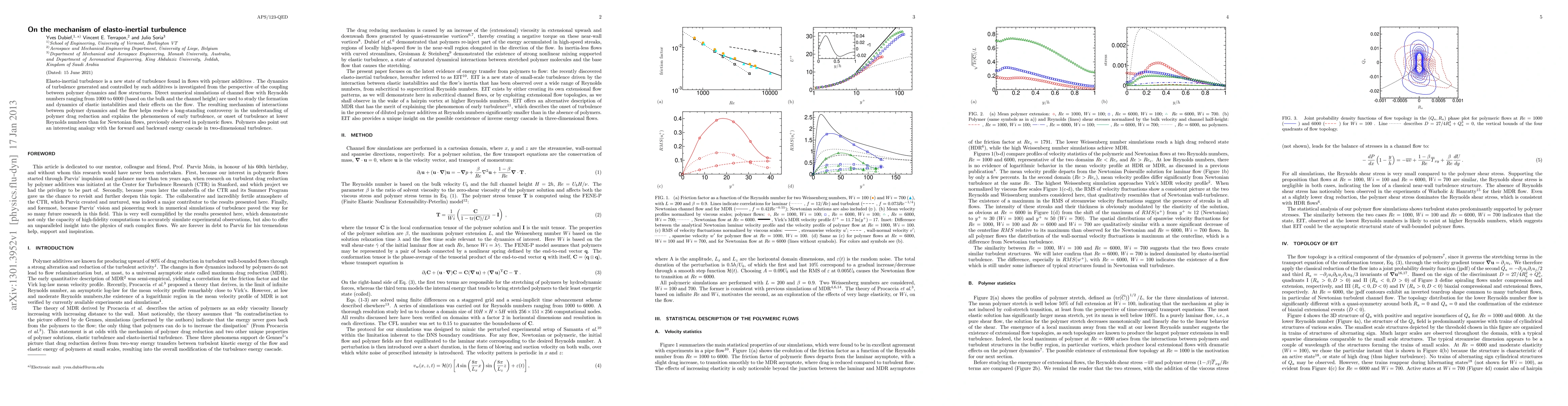 This paper investigates elasto-inertial turbulence in polymer-enhanced flows using direct numerical simulations, revealing the coupling between polymer dynamics and flow structures that leads to early turbulence onset. The study resolves long-standing questions about polymer drag reduction and highlights an analogy with two-dimensional turbulence energy cascades.