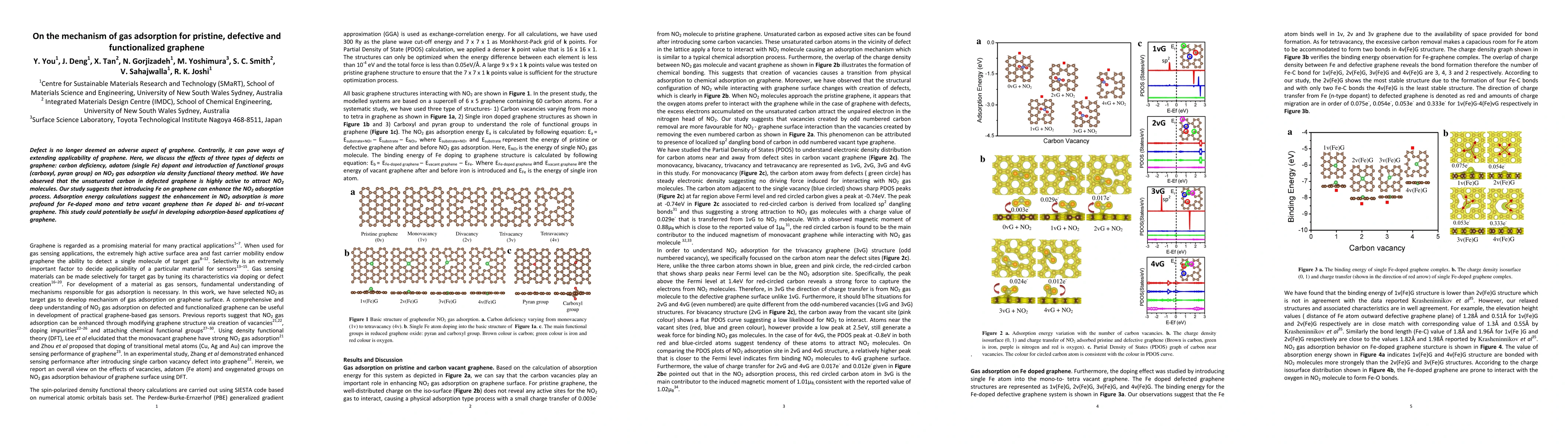 This study investigates how different defects in graphene—carbon deficiency, Fe dopants, and functional groups—affect NO2 gas adsorption using density functional theory. The research finds that defects increase graphene's activity for NO2 attraction, with Fe doping, especially in mono and tetra vacant graphene, showing the most significant enhancement in NO2 adsorption.