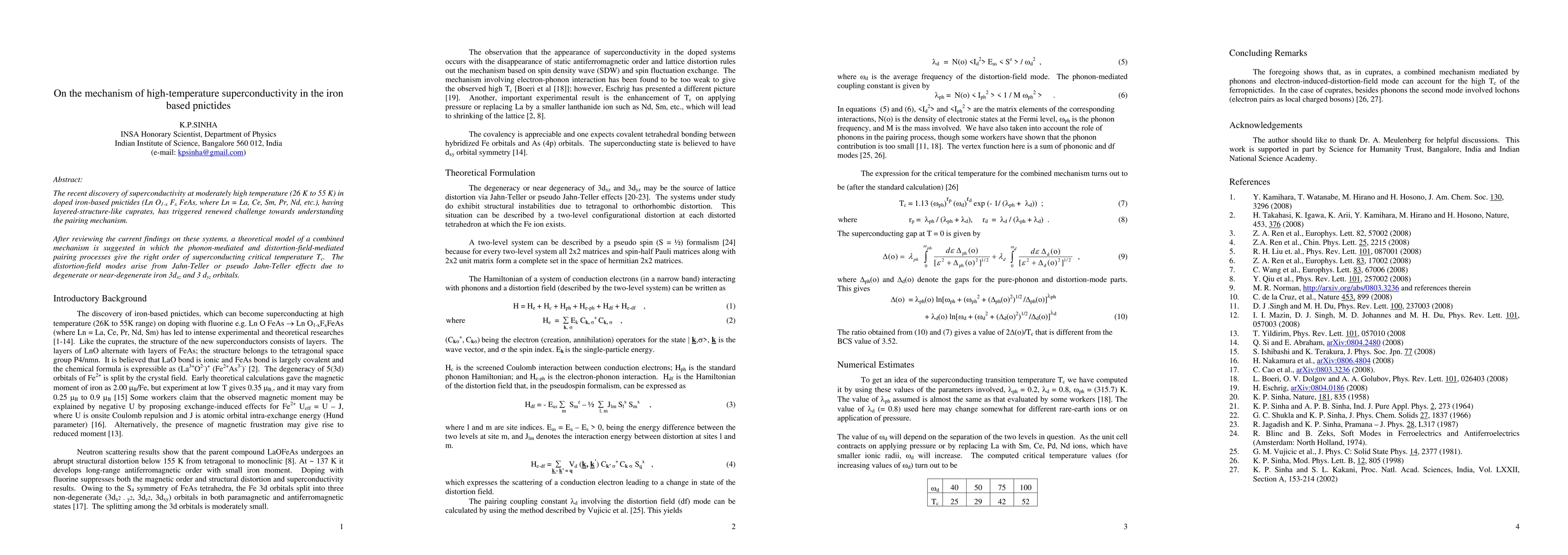 Summary: This paper explores the high-temperature superconductivity in iron-based pnictides, proposing a combined mechanism involving phonon-mediated and distortion-field-mediated pairing, where distortion-field modes result from Jahn-Teller or pseudo Jahn-Teller effects in iron orbitals.