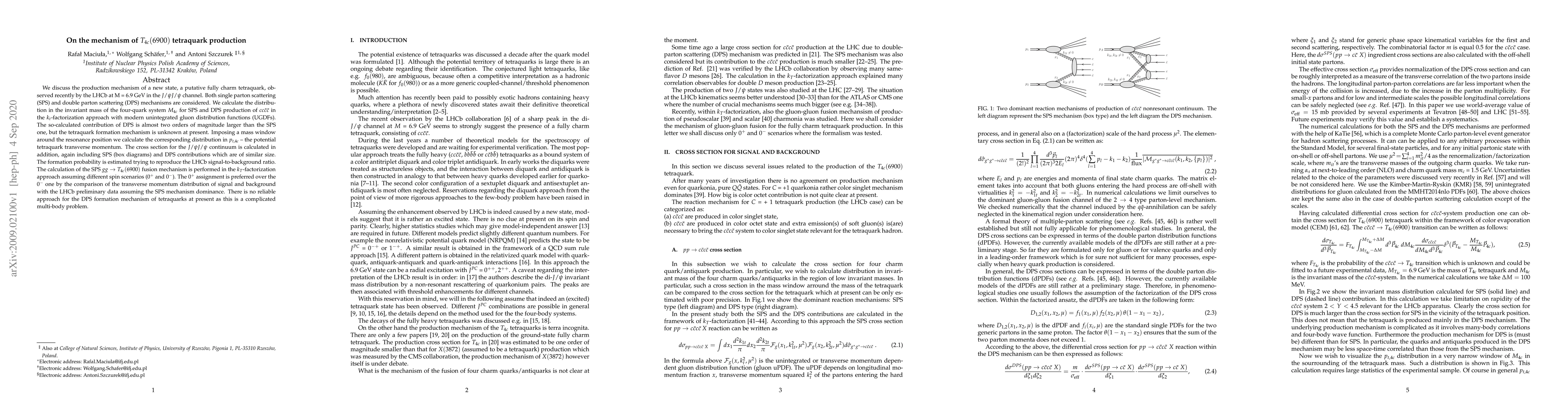 We discuss the production mechanism of a new state, a putative fully charm tetraquark, observed recently by the LHCb at M = 6.9 GeV in the $J/\psi J/\psi$ channel. Both single parton scattering (SPS) and double parton scattering (DPS) mechanisms are considered. We calculate the distribution in the invariant mass of the four-quark system $M_{4c}$ for SPS and DPS production of $c c \bar c \bar c$ in the $k_t$-factorization approach with modern unintegrated gluon distribution functions (UGDFs). The so-calculated contribution of DPS is almost two orders of magnitude larger than the SPS one, but the tetraquark formation mechanism is unknown at present. Imposing a mass window around the resonance position we calculate the corresponding distribution in $p_{t,4c}$ -- the potential tetraquark transverse momentum. The cross section for the $J/\psi J/\psi$ continuum is calculated in addition, again including SPS (box diagrams) and DPS contributions which are of similar size. The formation probability is estimated trying to reproduce the LHCb signal-to-background ratio. The calculation of the SPS $g g \to T_{4c}(6900)$ fusion mechanism is performed in the $k_T$-factorization approach assuming different spin scenarios ($0^+$ and $0^-$). The $0^+$ assignment is preferred over the $0^-$ one by the comparison of the transverse momentum distribution of signal and background with the LHCb preliminary data assuming the SPS mechanism dominance. There is no reliable approach for the DPS formation mechanism of tetraquarks at present as this is a complicated multi-body problem.