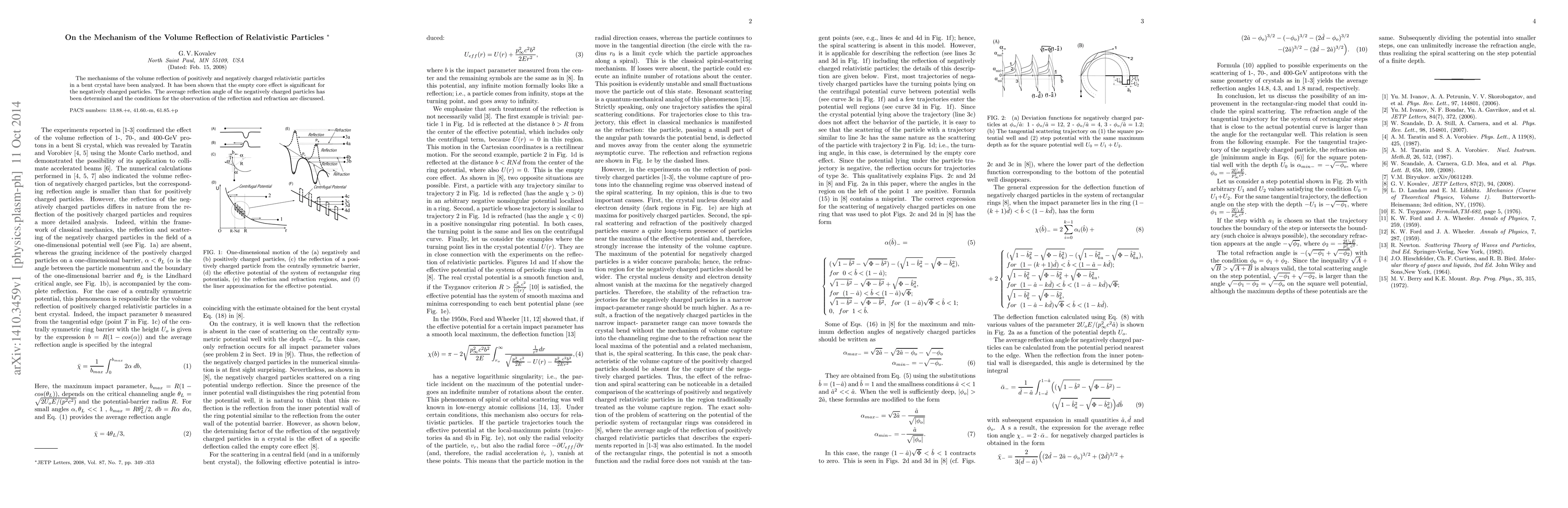This paper analyzes the mechanisms of volume reflection for relativistic particles in bent crystals, highlighting the significant empty core effect for negatively charged particles. It determines the average reflection angle for these particles and discusses conditions for observing reflection and refraction.