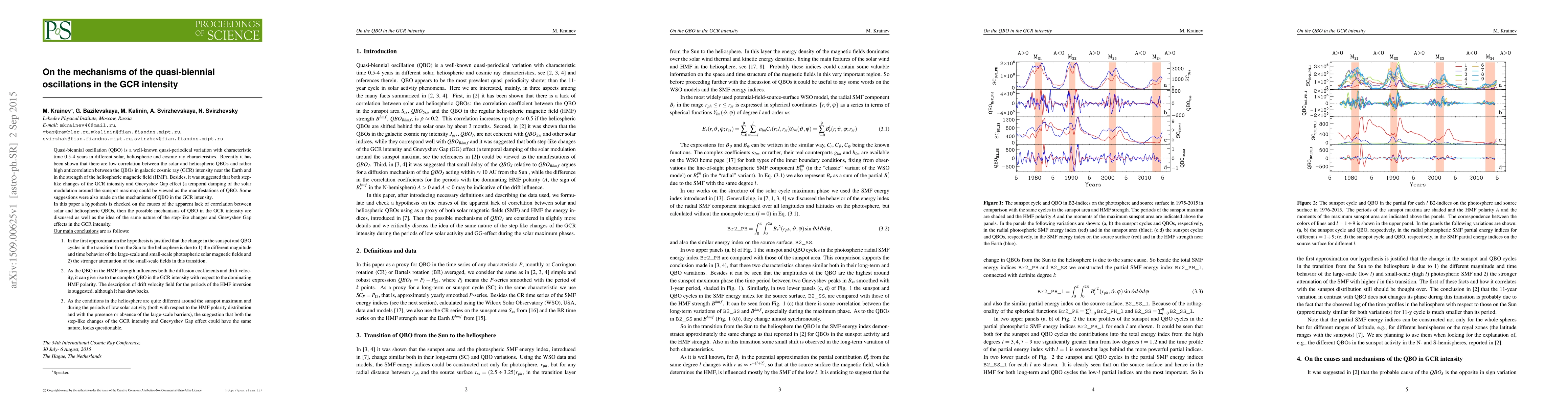 This paper investigates the quasi-biennial oscillations (QBO) in cosmic ray intensity, proposing mechanisms behind their complex nature, and explores the lack of correlation between solar and heliospheric QBOs. The study concludes that differences in solar magnetic fields and heliosphere conditions lead to varied QBO behaviors, questioning the same nature of step-like changes and Gnevyshev Gap effects in cosmic ray intensity.