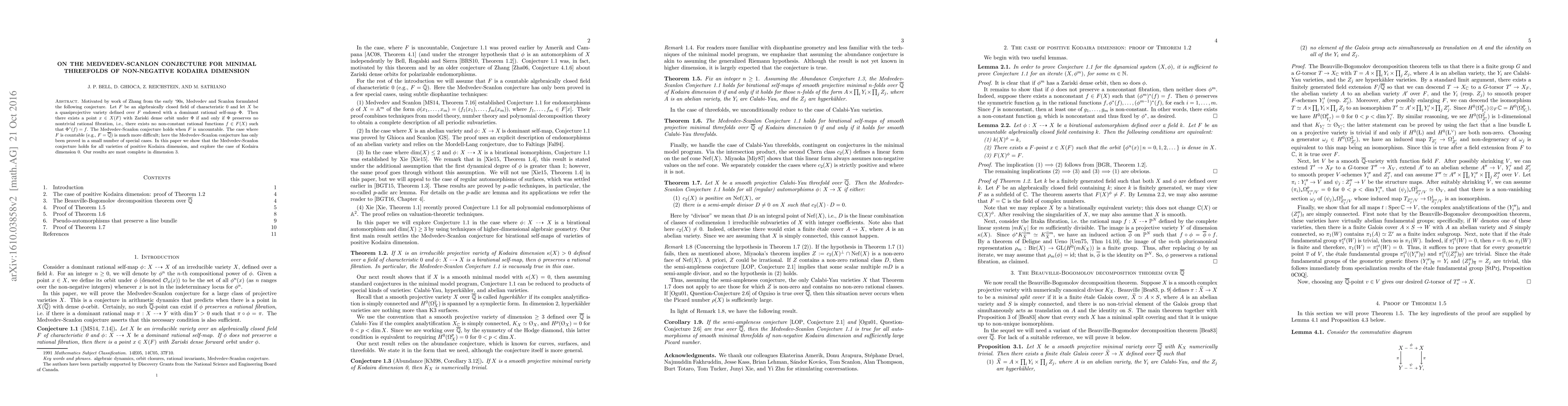 Motivated by work of Zhang from the early `90s, Medvedev and Scanlon formulated the following conjecture. Let $K$ be an algebraically closed field of characteristic $0$ and let $X$ be a quasiprojective variety defined over $K$ endowed with a dominant rational self-map $\Phi$. Then there exists a point $\alpha\in X(K)$ with Zariski dense orbit under $\Phi$ if and only if $\Phi$ preserves no nontrivial rational fibration, i.e., there exists no non-constant rational function $f\in K(X)$ such that $\Phi^*(f)=f$. The Medvedev-Scanlon conjecture holds when $K$ is uncountable. The case where $K$ is countable (e.g., $K=\overline{\mathbb{Q}}$) is much more difficult; here the conjecture has only been proved in a small number of special cases. In this paper we show that the Medvedev-Scanlon conjecture holds for all varieties of positive Kodaira dimension, and explore the case of Kodaira dimension $0$. Our results are most complete in dimension $3$.