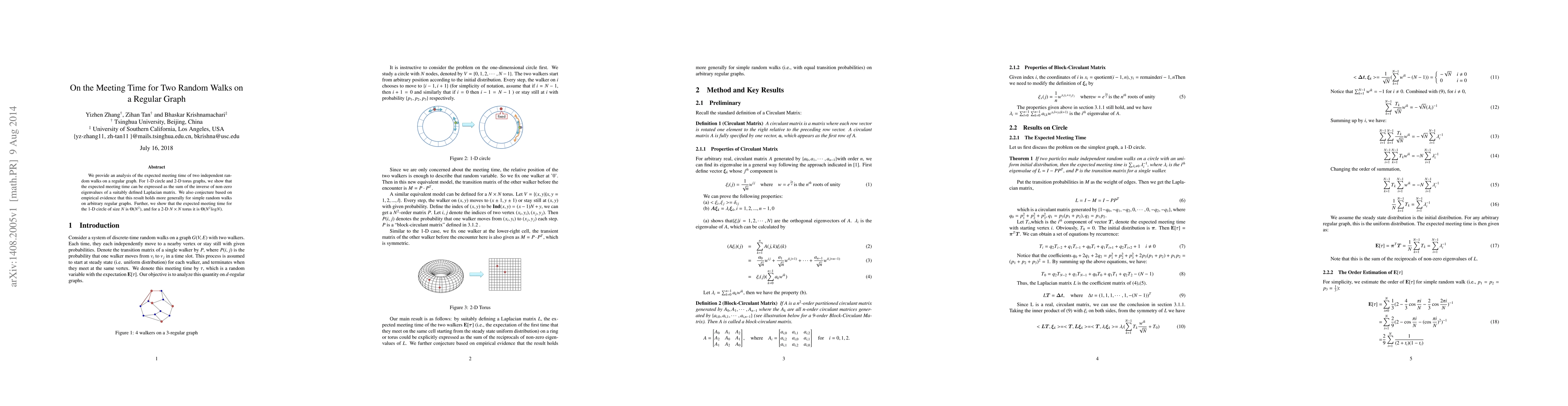 This paper analyzes the expected meeting time of two independent random walks on regular graphs, showing that for 1-D circles and 2-D toruses, it correlates with the sum of the inverses of non-zero eigenvalues of the graph's Laplacian matrix. It conjectures that this relationship generalizes to all regular graphs and provides specific meeting time estimates for these graph types.