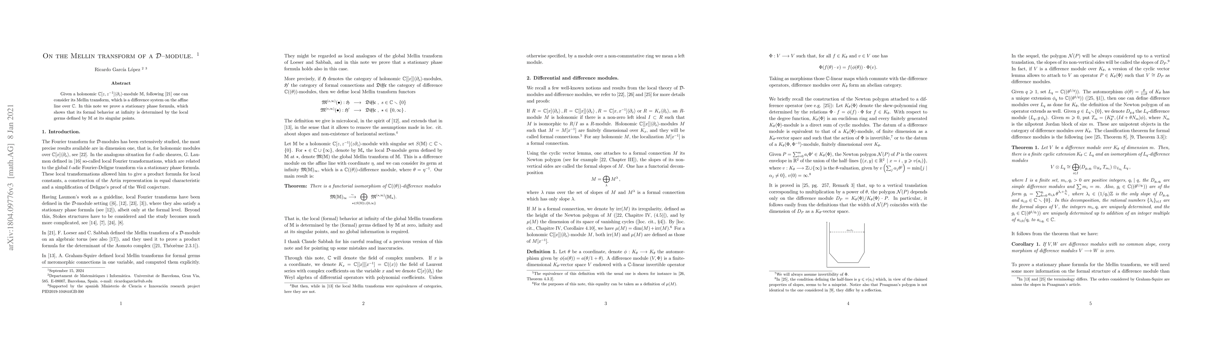 Summary: This paper proves a formal stationary phase formula for the Mellin transform of a holonomic D-module on a 1-dimensional torus, demonstrating that the transform's asymptotic behavior at infinity is governed by local germs defined at singular points of the module.