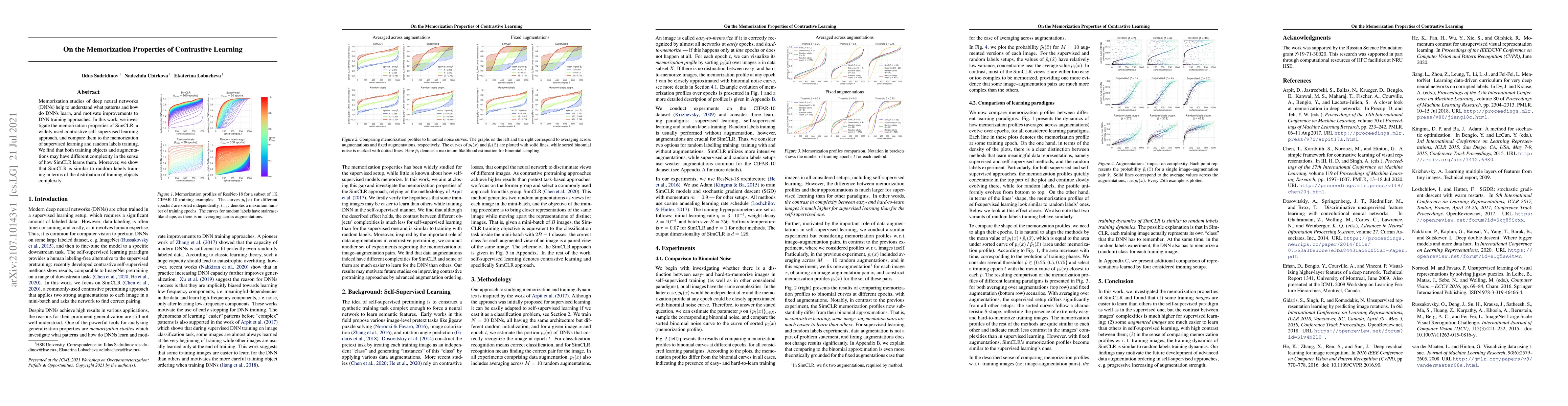 Memorization studies of deep neural networks (DNNs) help to understand what patterns and how do DNNs learn, and motivate improvements to DNN training approaches. In this work, we investigate the memorization properties of SimCLR, a widely used contrastive self-supervised learning approach, and compare them to the memorization of supervised learning and random labels training. We find that both training objects and augmentations may have different complexity in the sense of how SimCLR learns them. Moreover, we show that SimCLR is similar to random labels training in terms of the distribution of training objects complexity.