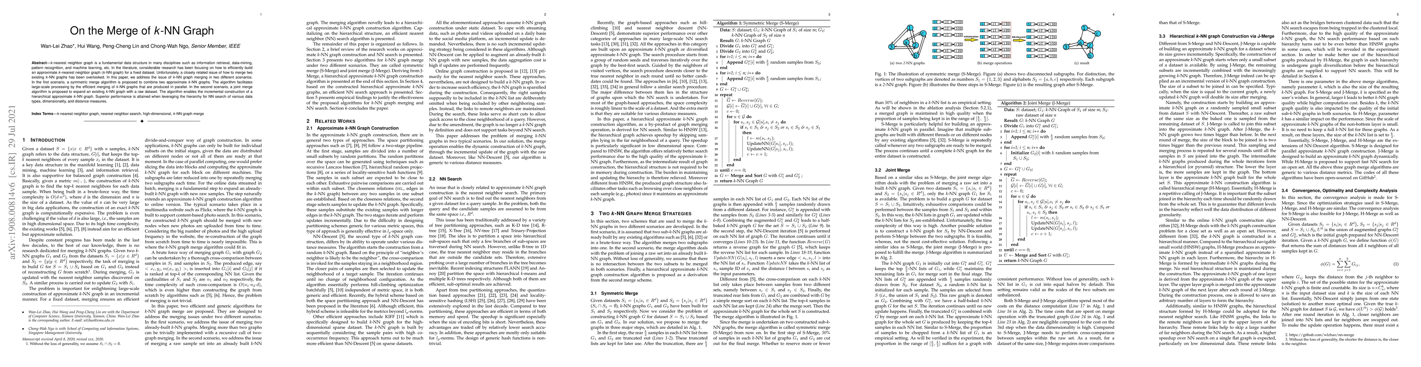 This paper proposes algorithms for merging k-nearest neighbor graphs in two scenarios: a symmetric merge for combining parallel-produced approximate k-NN graphs, and a joint merge for expanding an existing k-NN graph with new data, enabling efficient incremental construction and improved search performance.