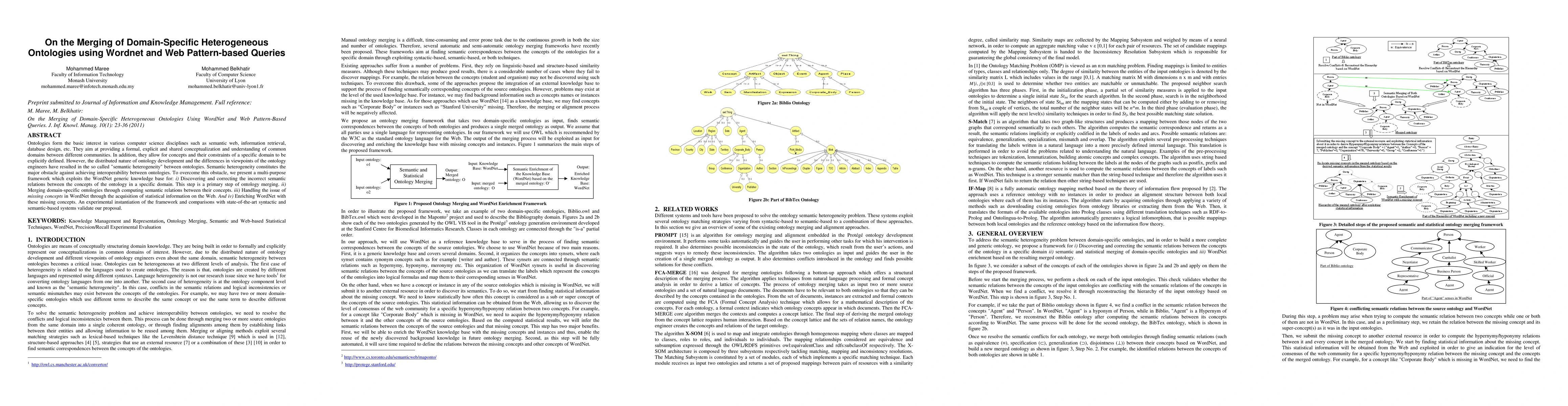 This paper proposes a framework to merge domain-specific heterogeneous ontologies using WordNet and web pattern-based queries, addressing semantic heterogeneity by discovering and correcting incorrect relations, merging ontologies, and enriching WordNet with missing concepts. Experimental results show the framework's effectiveness compared to state-of-the-art methods.