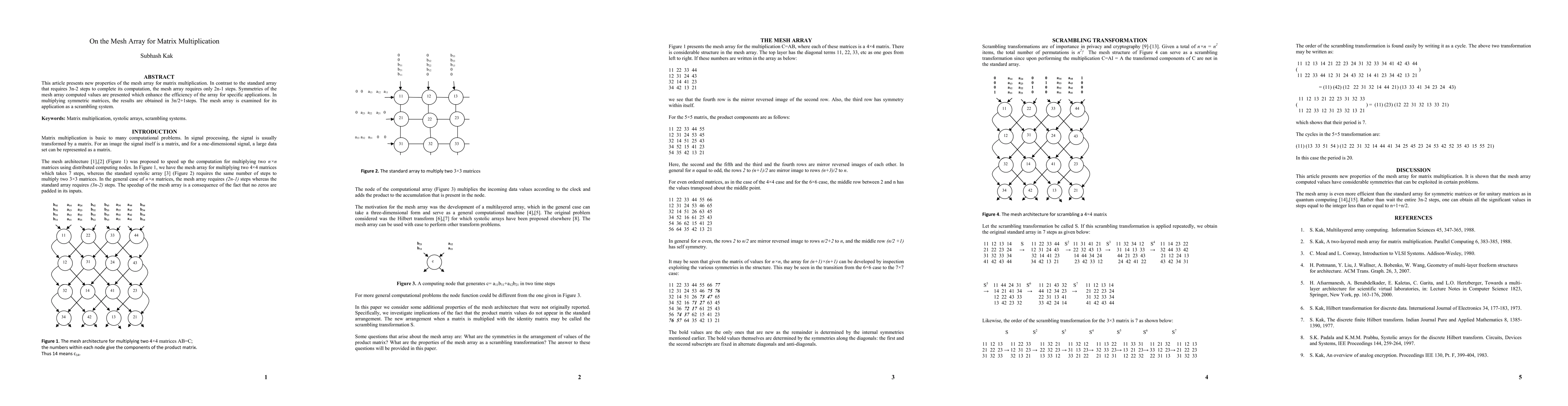 This article presents new properties of the mesh array for matrix multiplication. In contrast to the standard array that requires 3n-2 steps to complete its computation, the mesh array requires only 2n-1 steps. Symmetries of the mesh array computed values are presented which enhance the efficiency of the array for specific applications. In multiplying symmetric matrices, the results are obtained in 3n/2+1 steps. The mesh array is examined for its application as a scrambling system.