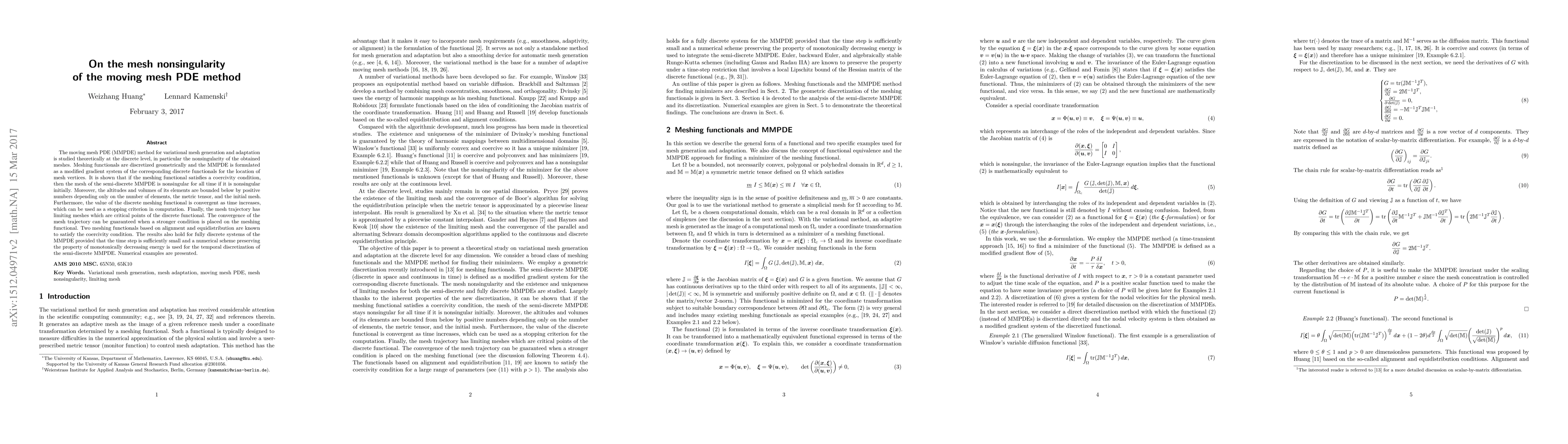 This paper investigates the theoretical properties of the moving mesh PDE method, focusing on the mesh nonsingularity and boundedness of element altitudes and volumes. It demonstrates that under a coercivity condition, the mesh remains nonsingular and elements' altitudes and volumes are bounded, ensuring convergence of the meshing functional. Numerical examples validate the theoretical findings.