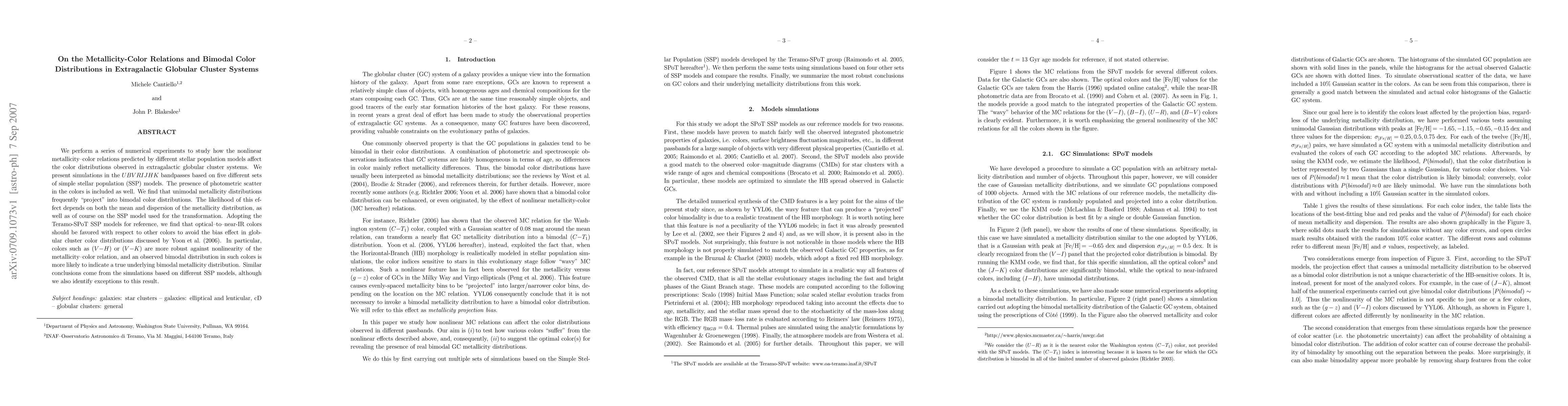 This paper investigates how metallicity-color relations from various stellar population models influence the observed color distributions in extragalactic globular cluster systems. It finds that unimodal metallicity distributions often appear bimodal in color due to model-dependent nonlinear effects, with optical-to-near-IR colors being more reliable for detecting true bimodal metallicity distributions.