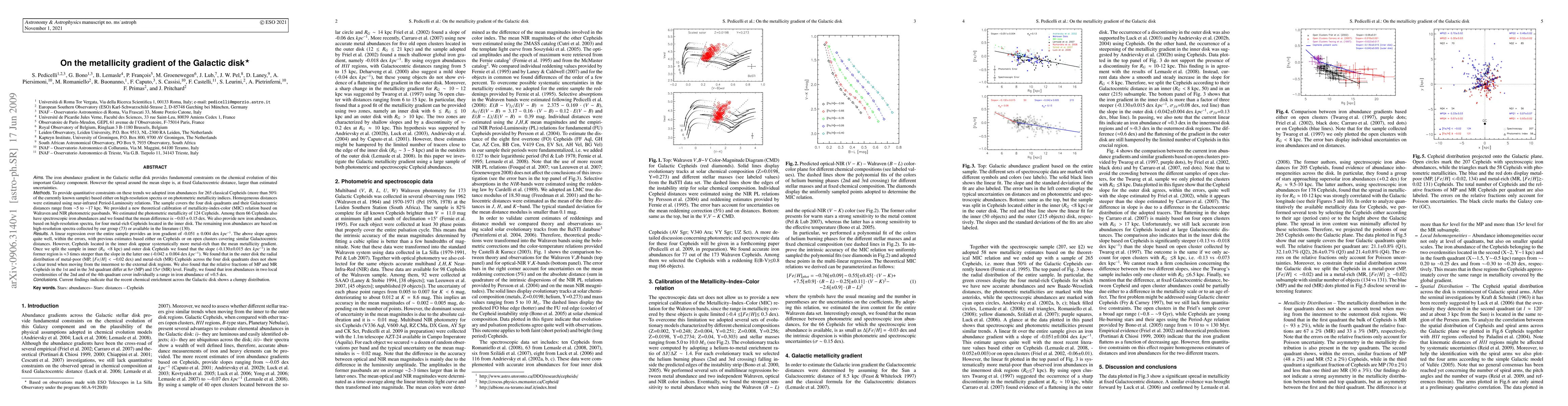 Aims: The iron abundance gradient in the Galactic stellar disk provides fundamental constraints on the chemical evolution of this important Galaxy component. However the spread around the mean slope is, at fixed Galactocentric distance, larger than estimated uncertainties. Methods: To provide quantitative constraints on these trends we adopted iron abundances for 265 classical Cepheids (more than 50% of the currently known sample) based either on high-resolution spectra or on photometric metallicity indices. Homogeneous distances were estimated using near-infrared Period-Luminosity relations. The sample covers the four disk quadrants and their Galactocentric distances range from ~5 to ~17 kpc. Results: A linear regression over the entire sample provides an iron gradient of -0.051+/-0.004 dex/kpc. The above slope agrees quite well, within the errors, with previous estimates based either on Cepheids or on open clusters covering similar Galactocentric distances. However, once we split the sample in inner (Rg < 8 kpc) and outer disk Cepheids we found that the slope (-0.130+/-0.015 dex/kpc) in the former region is ~3 times steeper than the slope in the latter one (-0.042+/-0.004 dex/kpc). We found that in the outer disk the radial distribution of metal-poor (MP, [Fe/H]<-0.02 dex) and metal-rich (MR) Cepheids across the four disk quadrants does not show a clear trend when moving from the innermost to the external disk regions. We also found that the relative fractions of MP and MR Cepheids in the 1st and in the 3rd quadrant differ at 8 sigma (MP) and 15 sigma (MR) level.