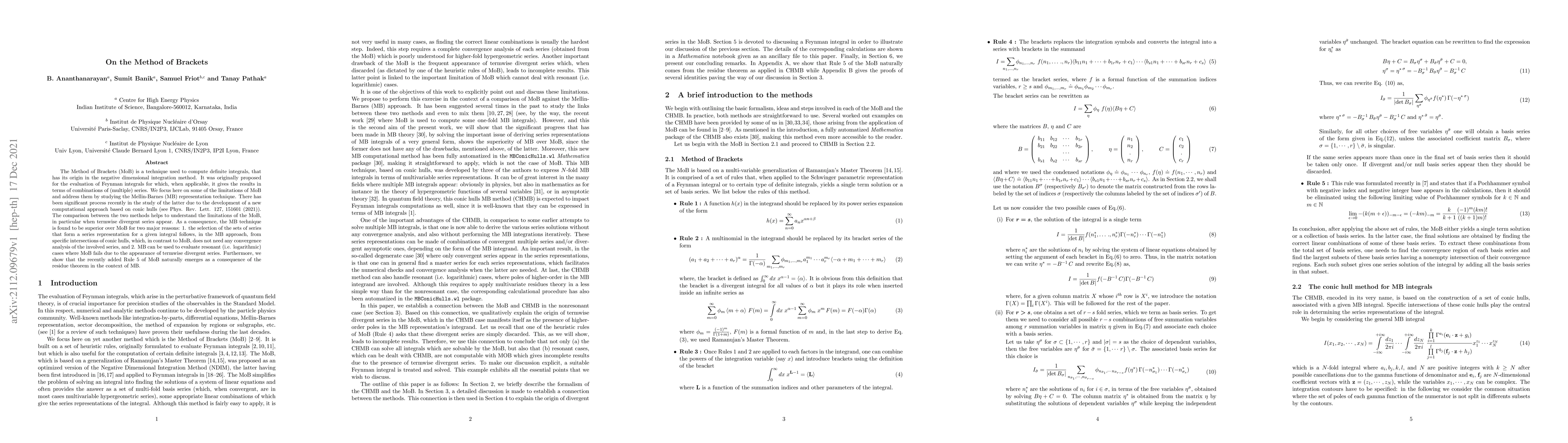 Researchers studied the Method of Brackets technique for computing definite integrals and found that a new approach called Mellin-Barnes representation is superior in addressing termwise divergent series, offering a more reliable method with fewer requirements.