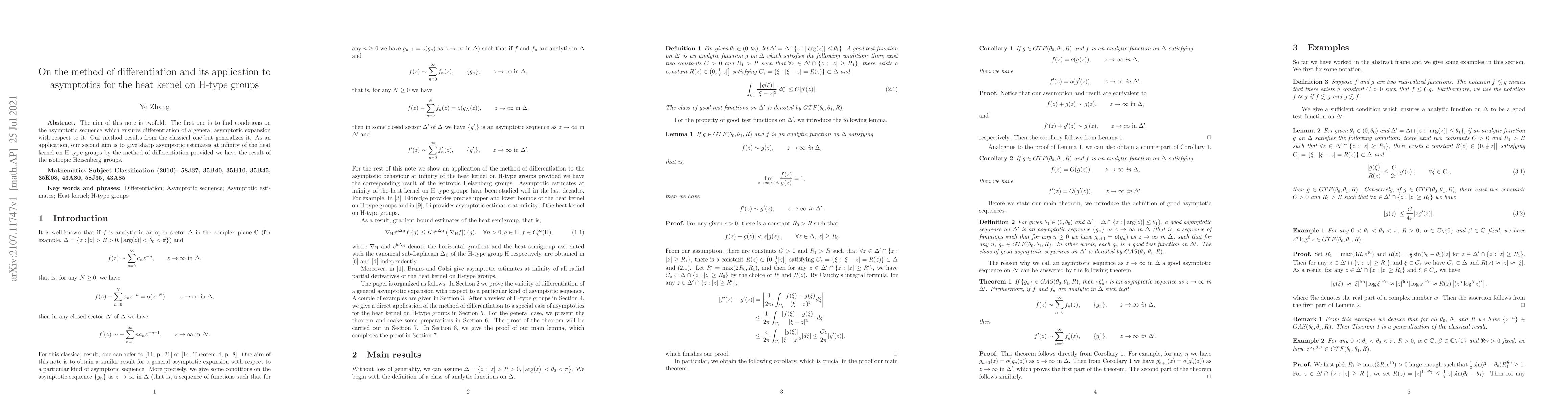The paper develops a new method for differentiating asymptotic expansions with respect to their sequences, which is applied to estimate the heat kernel on H-type groups.