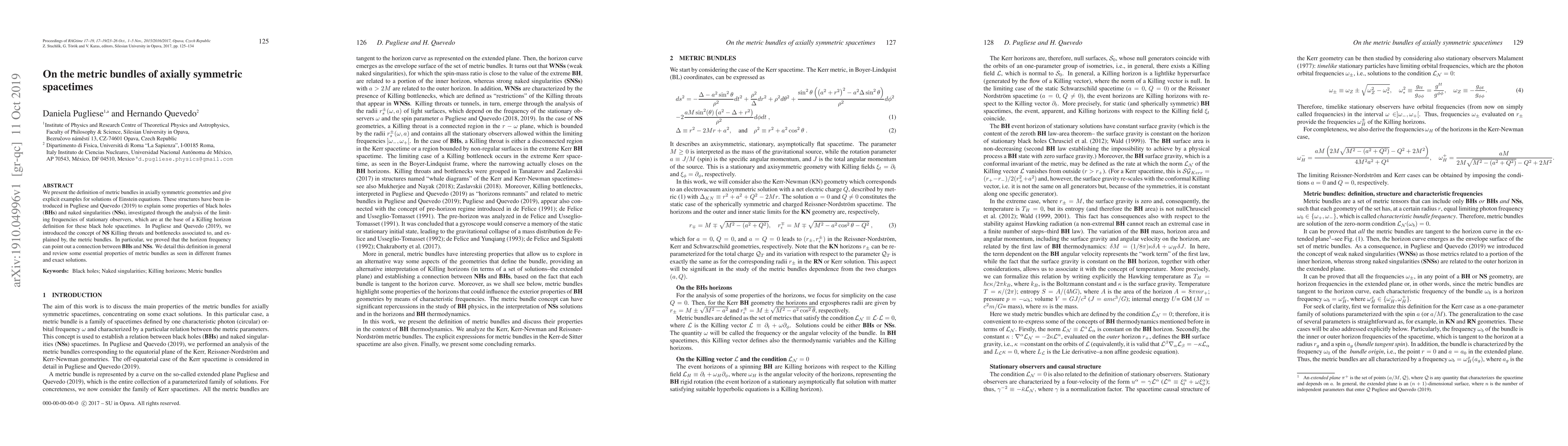 We present the definition of metric bundles in axially symmetric geometries and give explicit examples for solutions of Einstein equations. These structures have been introduced in Pugliese and Quevedo (2019) to explain some properties of black holes (BHs) and naked singularities (NSs), investigated through the analysis of the limiting frequencies of stationary observers, which are at the base of a Killing horizon definition for these black hole spacetimes. In Pugliese and Quevedo (2019), we introduced the concept of NS Killing throats and bottlenecks associated to, and explained by, the metric bundles. In particular, we proved that the horizon frequency can point out a connection between BHs and NSs. We detail this definition in general and review some essential properties of metric bundles as seen in different frames and exact solutions.