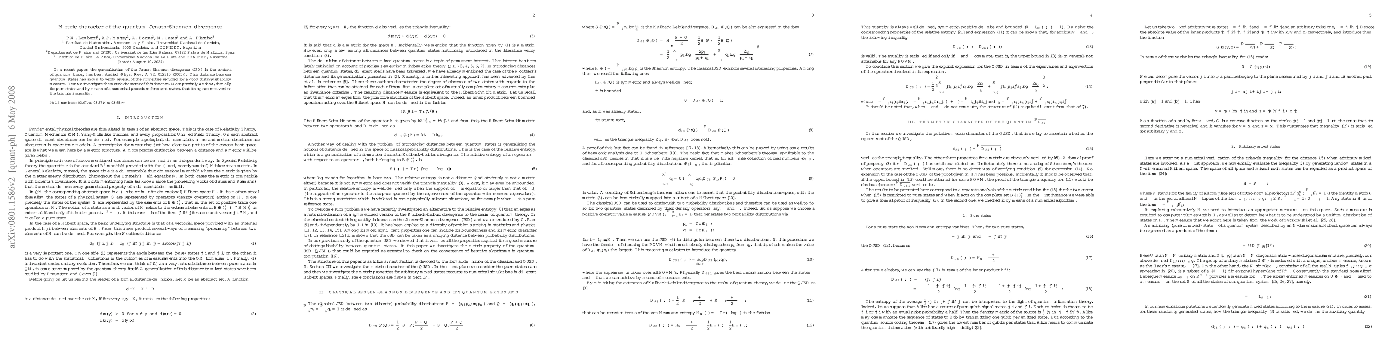 This paper investigates whether the quantum Jensen-Shannon divergence, a measure of distance between quantum states, satisfies the metric properties. It formally proves the triangle inequality for pure states and demonstrates it through simulations for mixed states.