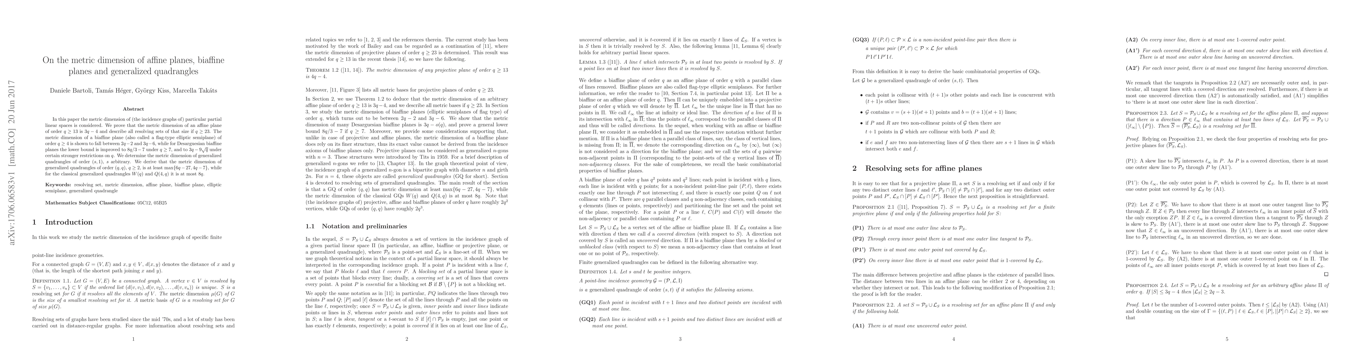 This paper investigates the metric dimension of incidence graphs for specific partial linear spaces, including affine planes, biaffine planes, and generalized quadrangles. It finds that affine planes of order $q\geq13$ have a metric dimension of $3q-4$ and resolvents of that size for $q\geq23$. For biaffine planes, the metric dimension ranges between $2q-2$ and $3q-6$, with improved bounds for Desarguesian biaffine planes. The metric dimension of generalized quadrangles is determined, with specific bounds for $(q,q)$ and classical types $W(q)$ and $Q(4,q)$.
