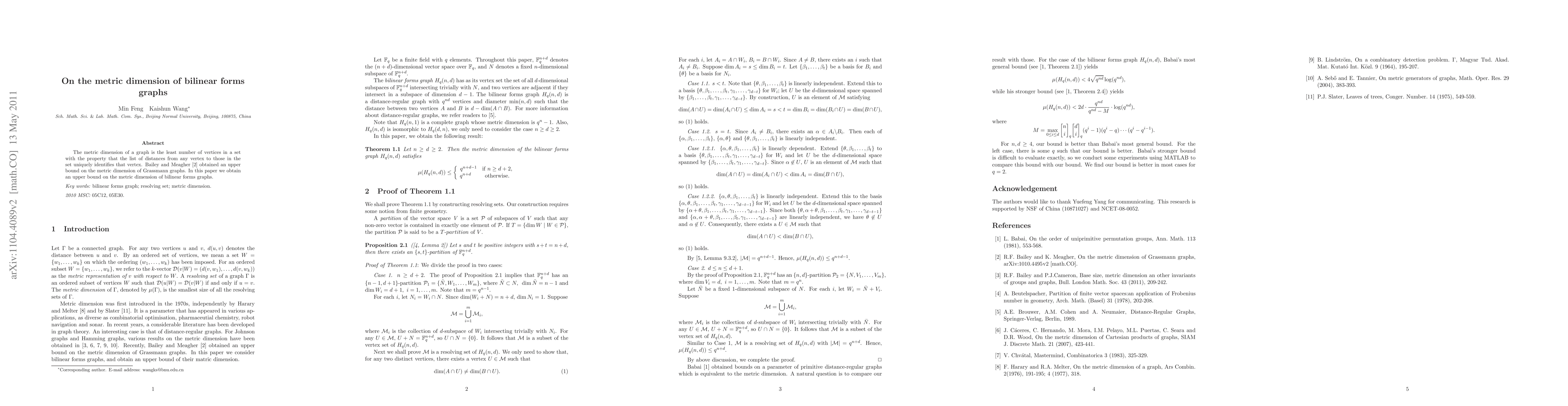 This paper investigates the metric dimension of bilinear forms graphs, determining an upper bound for the minimum number of vertices required to uniquely identify any vertex through the list of distances from it to these vertices, extending previous work on Grassmann graphs.