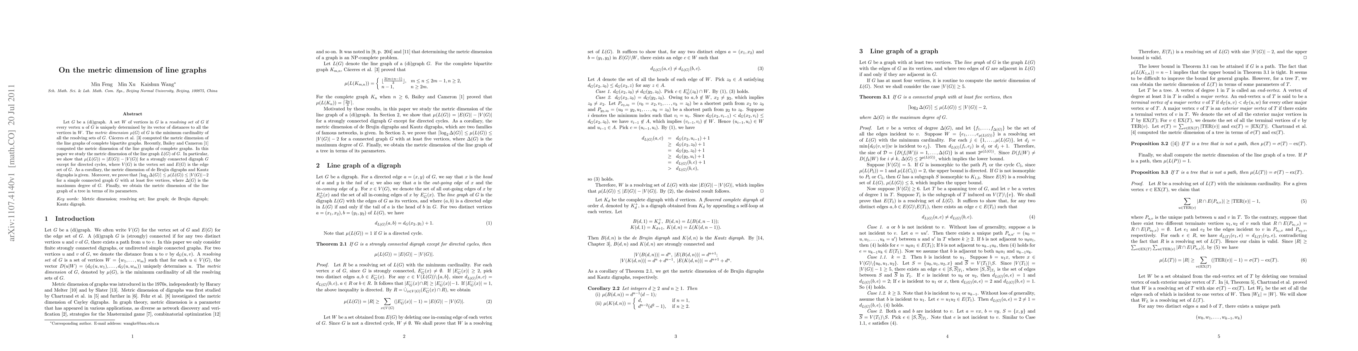 This paper investigates the metric dimension of line graphs of digraphs and simple connected graphs. It establishes that for strongly connected digraphs, except for directed cycles, the metric dimension equals $|E(G)|-|V(G)|$, and provides bounds and specific results for the metric dimension of de Brujin digraphs, Kautz digraphs, and trees.