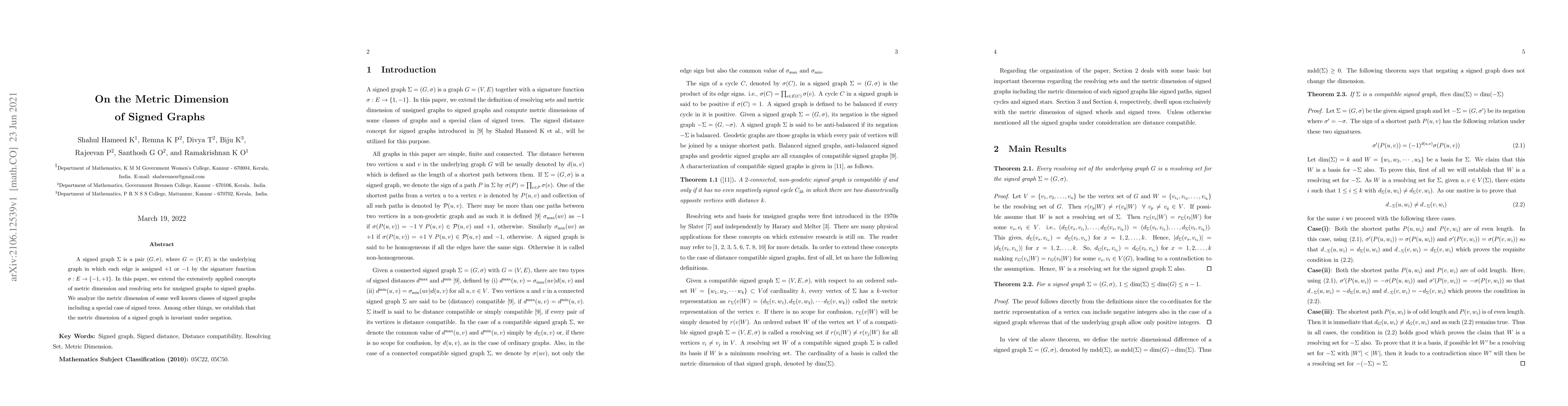 This paper explores the metric dimension of signed graphs, a concept from unsigned graphs extended to include edge signatures, with key findings including invariance under negation and analysis of well-known classes of signed graphs.
