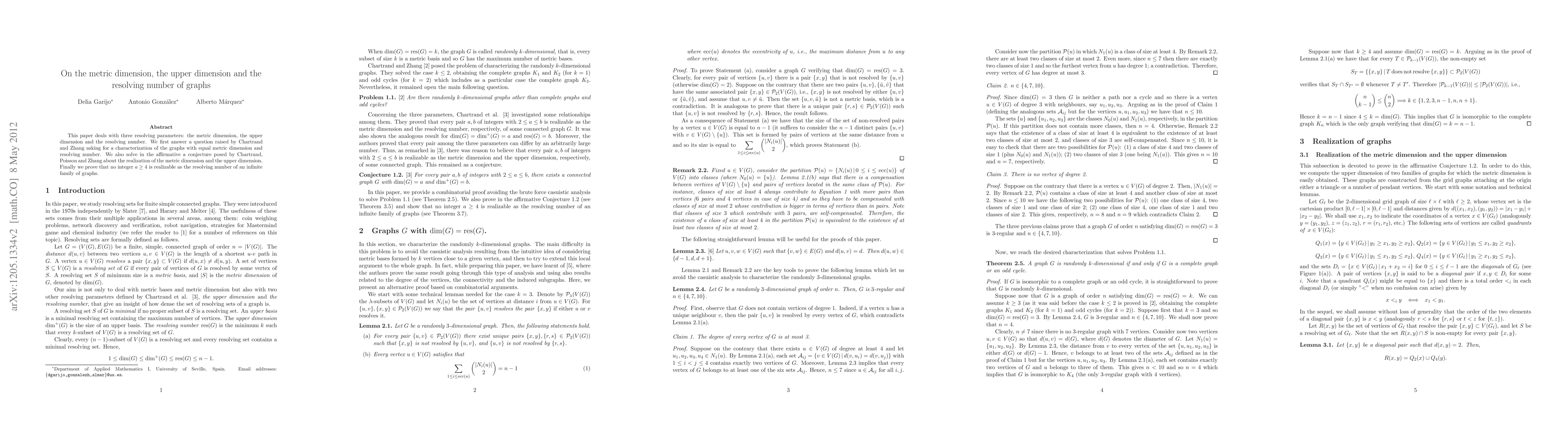 This paper characterizes graphs with equal metric dimension and resolving number, confirms a conjecture about the metric dimension and upper dimension, and proves that no integer $a \geq 4$ can be the resolving number for an infinite family of graphs.