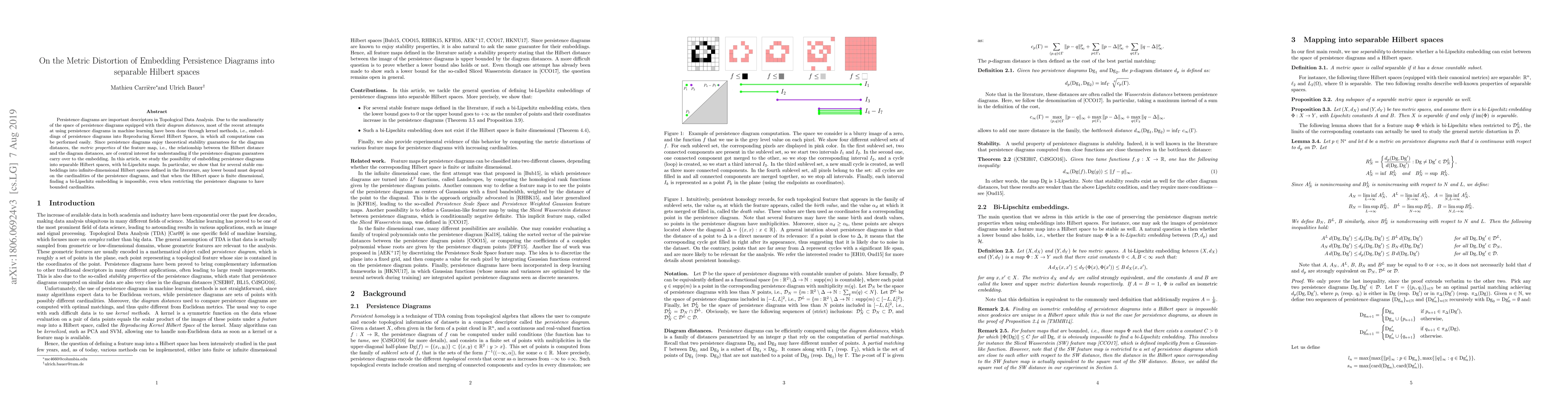 This paper explores the embedding of persistence diagrams into separable Hilbert spaces using bi-Lipschitz maps. It finds that stable embeddings into infinite-dimensional spaces depend on diagram cardinalities, and finite-dimensional Hilbert spaces cannot support bi-Lipschitz embeddings, regardless of bounded cardinalities.