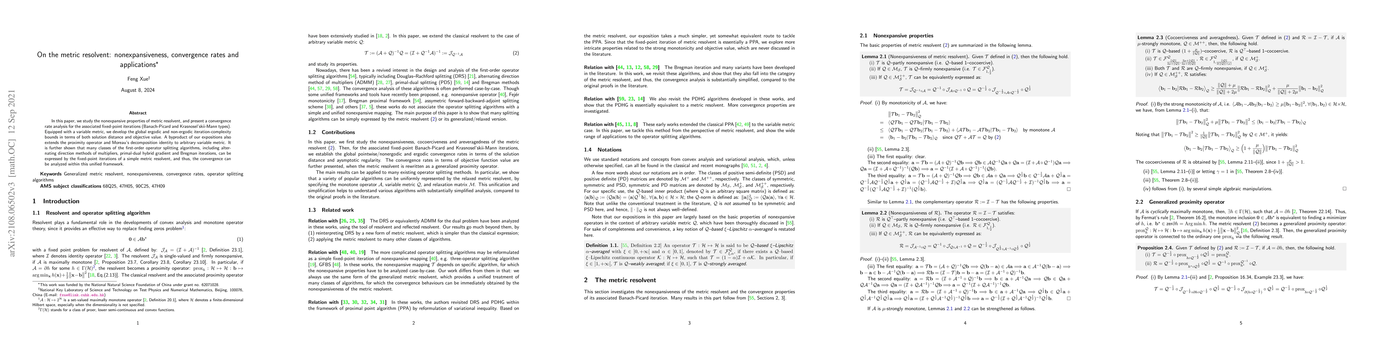 In this paper, we study the nonexpansive properties of metric resolvent, and present a convergence rate analysis for the associated fixed-point iterations (Banach-Picard and Krasnosel'skii-Mann types). Equipped with a variable metric, we develop the global ergodic and non-ergodic iteration-complexity bounds in terms of both solution distance and objective value. A byproduct of our expositions also extends the proximity operator and Moreau's decomposition identity to arbitrary variable metric. It is further shown that many classes of the first-order operator splitting algorithms, including alternating direction methods of multipliers, primal-dual hybrid gradient and Bregman iterations, can be expressed by the fixed-point iterations of a simple metric resolvent, and thus, the convergence can be analyzed within this unified framework.