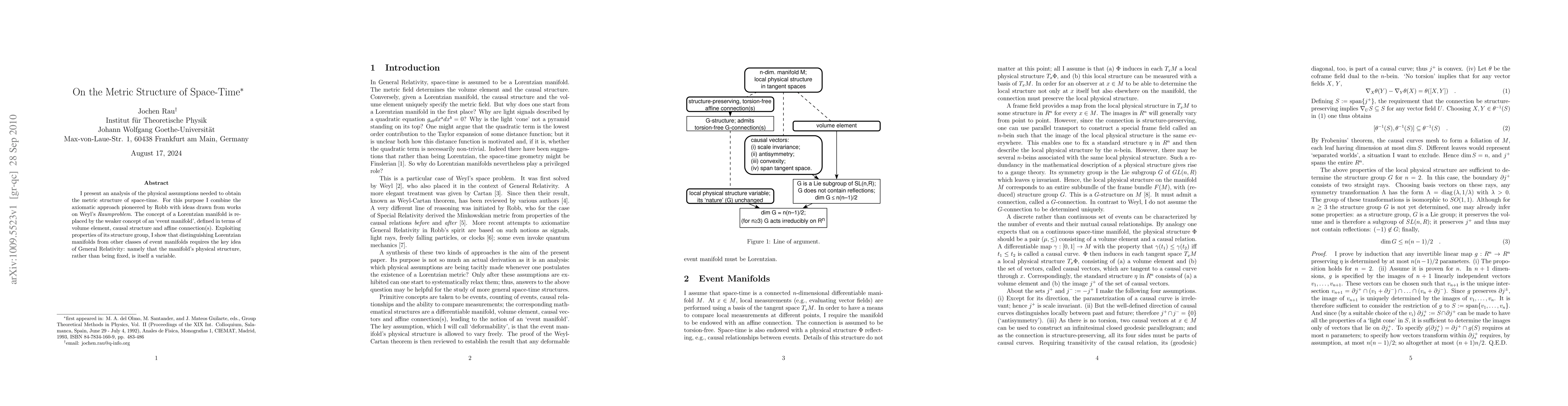 I present an analysis of the physical assumptions needed to obtain the metric structure of space-time. For this purpose I combine the axiomatic approach pioneered by Robb with ideas drawn from works on Weyl's "Raumproblem". The concept of a Lorentzian manifold is replaced by the weaker concept of an "event manifold", defined in terms of volume element, causal structure and affine connection(s). Exploiting properties of its structure group, I show that distinguishing Lorentzian manifolds from other classes of event manifolds requires the key idea of general relativity: namely that the manifold's physical structure, rather than being fixed, is itself a variable.