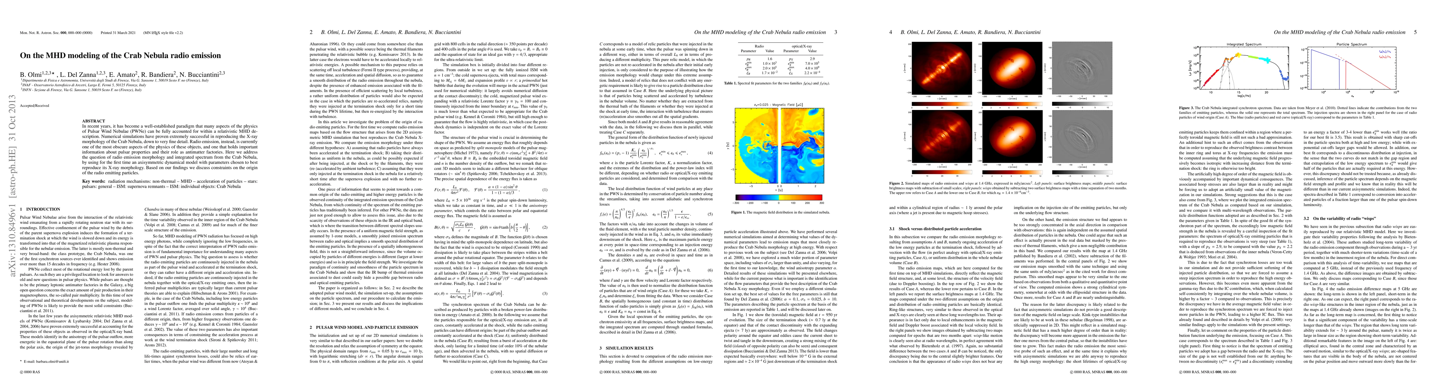 This paper investigates the radio emission of the Crab Nebula using relativistic magnetohydrodynamic (MHD) modeling, aiming to understand the morphology and integrated spectrum of its radio emission. The study finds constraints on the origin of radio-emitting particles, providing insights into pulsar properties and their role in antimatter production.