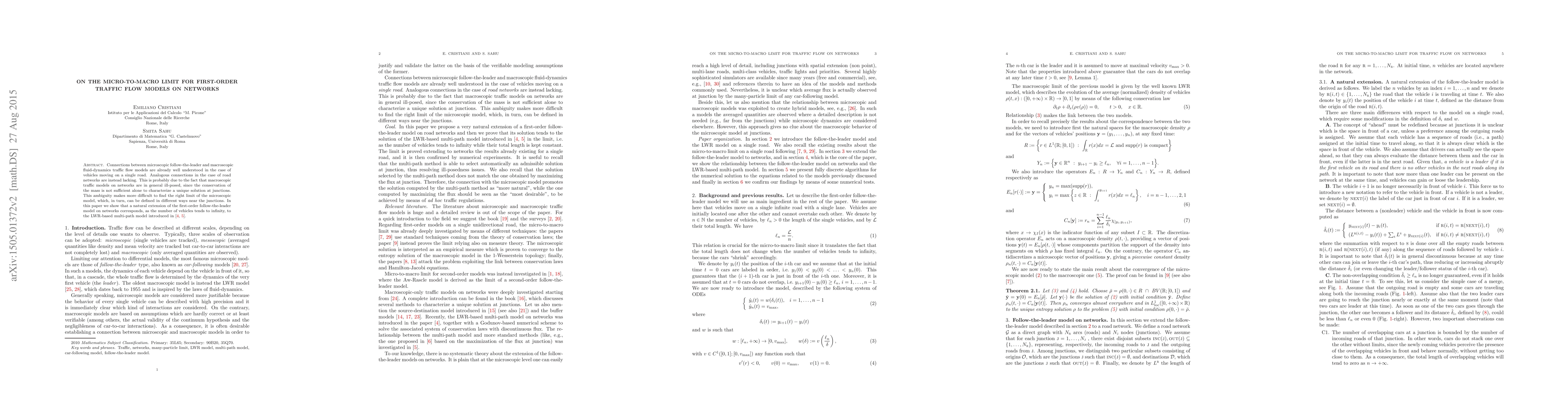 This paper investigates the connection between microscopic follow-the-leader traffic models on networks and macroscopic fluid-dynamics models, demonstrating that a first-order model converges to the LWR-based multi-path model as vehicle numbers increase. The study addresses the ambiguity in macroscopic models on networks, providing a clearer micro-to-macro limit.