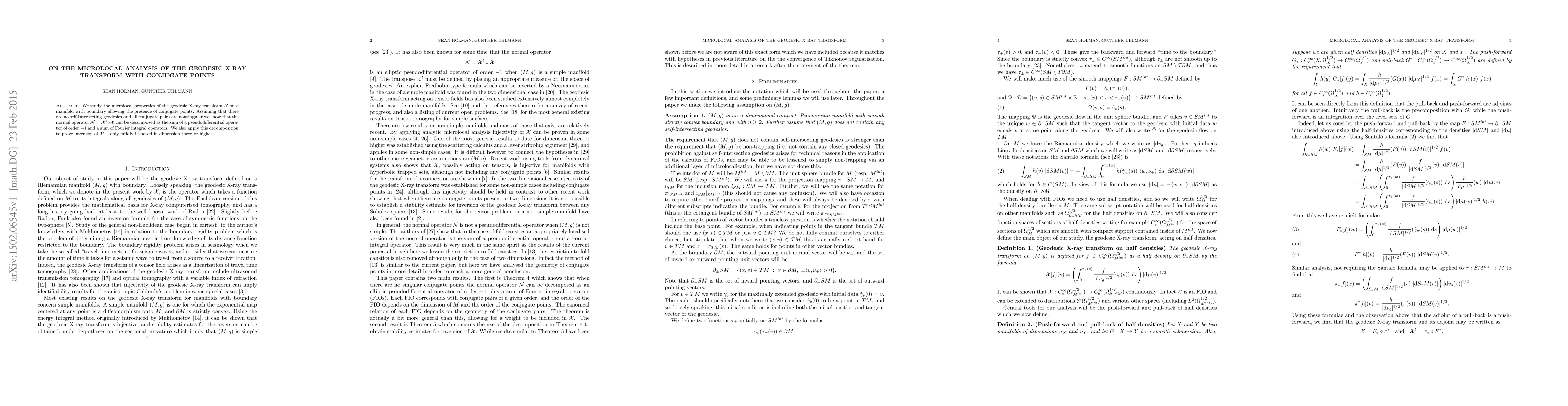 This paper investigates the microlocal properties of the geodesic X-ray transform on manifolds with conjugate points, showing that the normal operator can be decomposed into a pseudodifferential operator and Fourier integral operators. It concludes that inversion of the transform is only mildly ill-posed in dimensions three or higher.