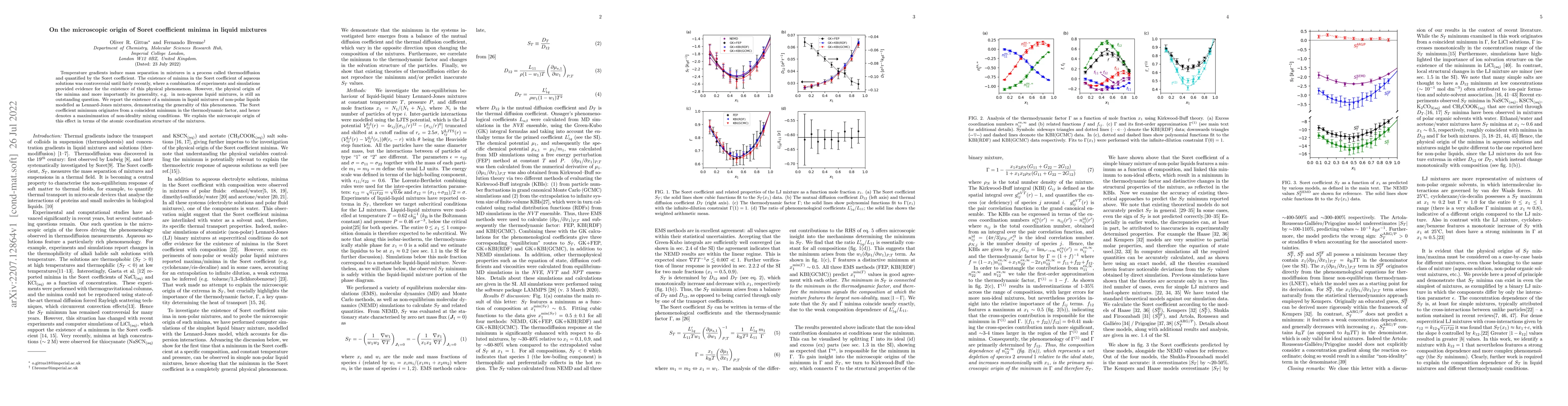 This paper investigates the microscopic origin of Soret coefficient minima in liquid mixtures, revealing that such minima are generalizable to non-aqueous mixtures. The study demonstrates that minima arise from a coincident minimum in the thermodynamic factor, linked to the atomic coordination structure of the mixtures.