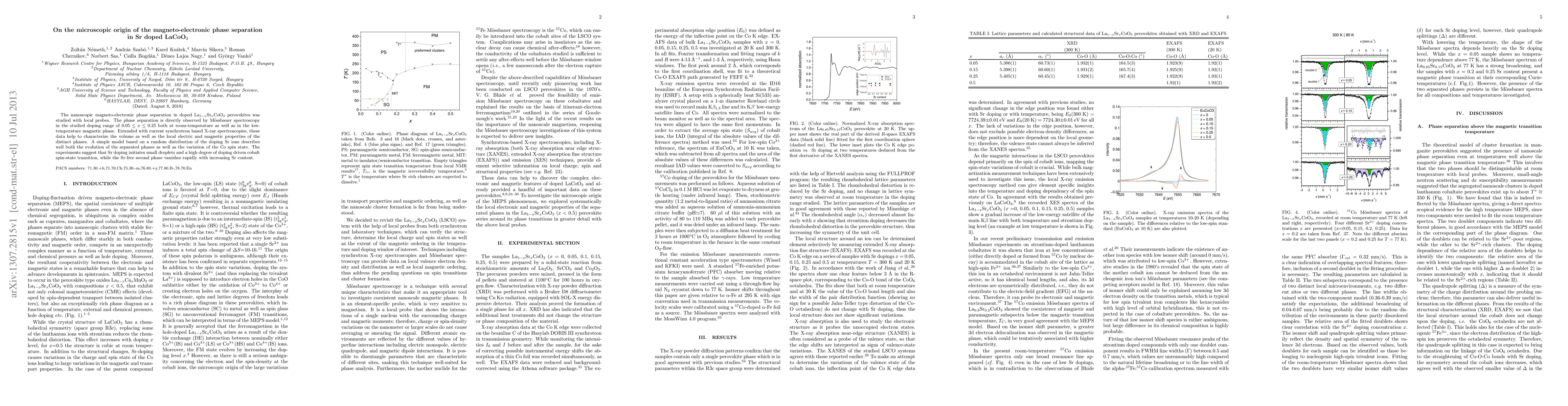 This paper investigates the microscopic origin of magneto-electronic phase separation in Sr-doped LaCoO3 perovskites using Mössbauer spectroscopy and synchrotron-based X-ray spectroscopies. The findings reveal that Sr doping leads to distinct phase separation and a cobalt spin-state transition, with a simple model explaining the evolution of these phases.