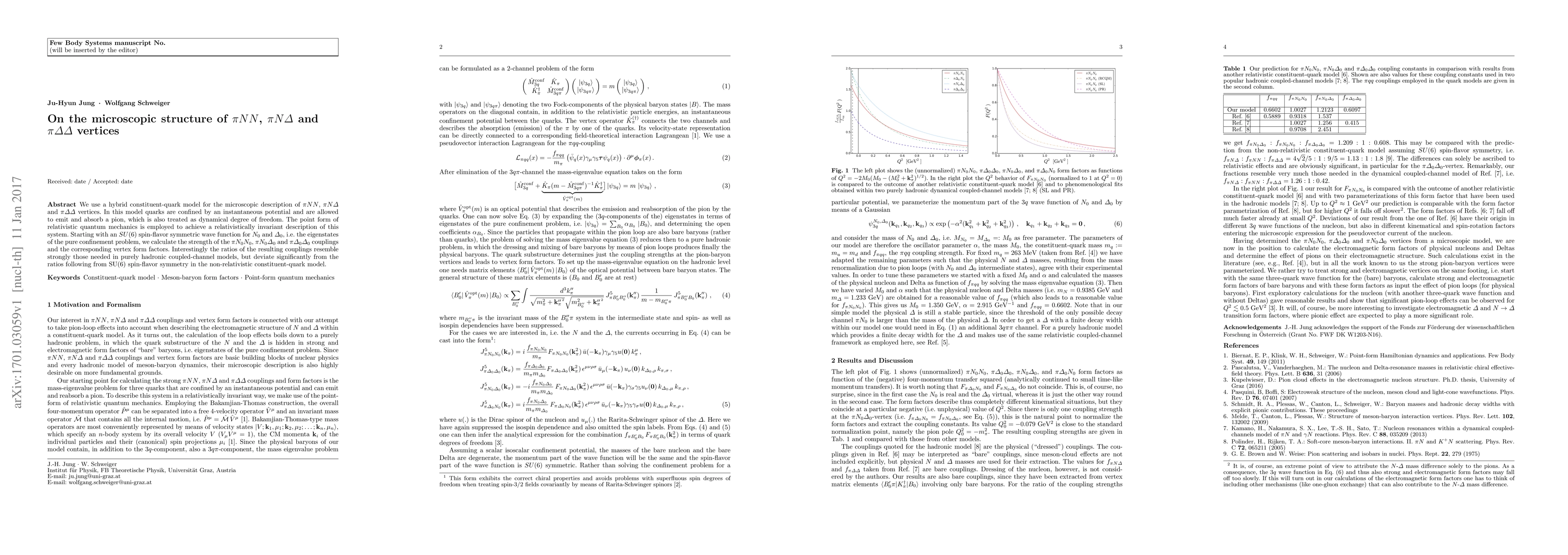 We use a hybrid constituent-quark model for the microscopic description of $\pi N N$, $\pi N \Delta$ and $\pi \Delta \Delta$ vertices. In this model quarks are confined by an instantaneous potential and are allowed to emit and absorb a pion, which is also treated as dynamical degree of freedom. The point form of relativistic quantum mechanics is employed to achieve a relativistically invariant description of this system. Starting with an $SU(6)$ spin-flavor symmetric wave function for $N_0$ and $\Delta_0$, i.e. the eigenstates of the pure confinement problem, we calculate the strength of the $\pi N_0 N_0$, $\pi N_0 \Delta_0$ and $\pi \Delta_0 \Delta_0$ couplings and the corresponding vertex form factors. Interestingly the ratios of the resulting couplings resemble strongly those needed in purely hadronic coupled-channel models, but deviate significantly from the ratios following from SU(6) spin-flavor symmetry in the non-relativistic constituent-quark model.