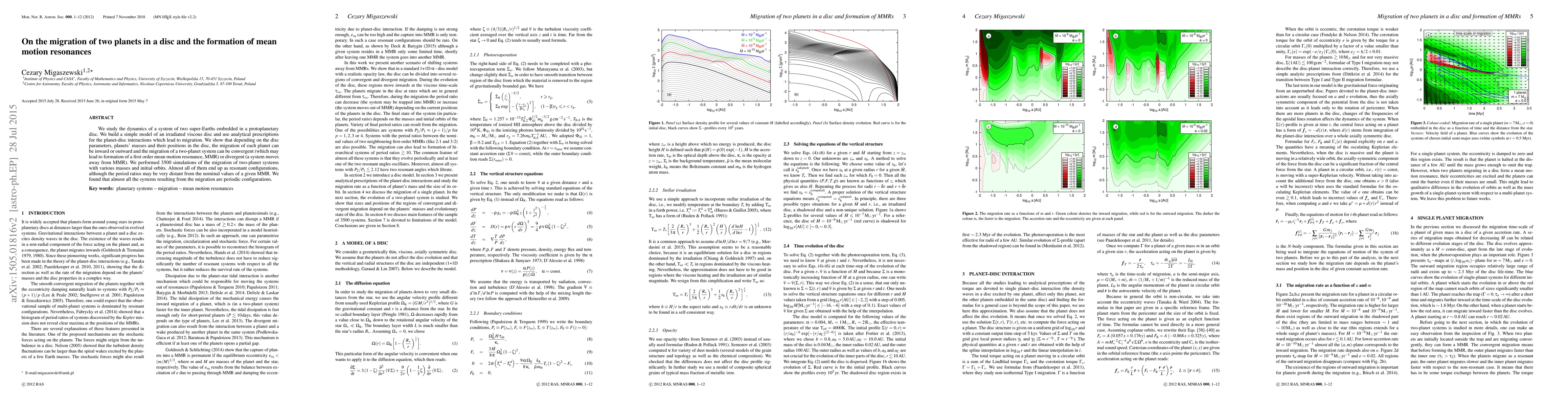 We study the dynamics of a system of two super-Earths embedded in a protoplanetary disc. We build a simple model of an irradiated viscous disc and use analytical prescriptions for the planet-disc interactions which lead to migration. We show that depending on the disc parameters, planets' masses and their positions in the disc, the migration of each planet can be inward or outward and the migration of a two-planet system can be convergent (which may lead to formation of a first order mean motion resonance, MMR) or divergent (a system moves away from MMR). We performed $3500$ simulations of the migration of two-planet systems with various masses and initial orbits. Almost all of them end up as resonant configurations, although the period ratios may be very distant from the nominal values of a given MMR. We found that almost all the systems resulting from the migration are periodic configurations.