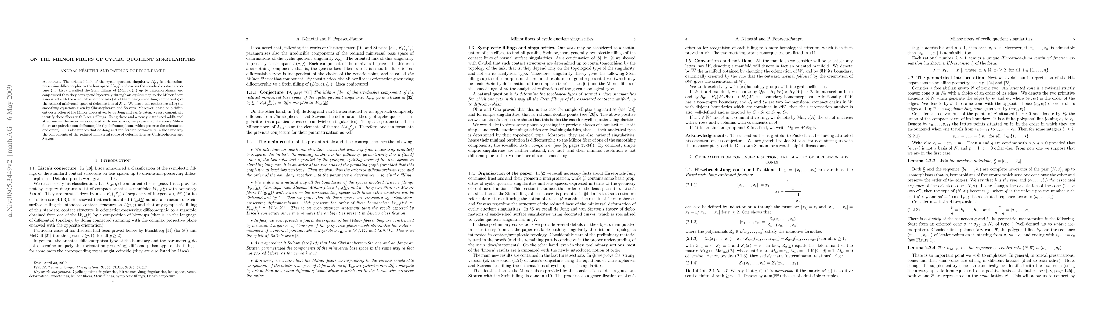 This paper proves Lisca's conjecture linking the Milnor fibers of cyclic quotient singularities to the Stein fillings of their associated lens spaces, and shows these fibers are pairwise non-diffeomorphic using an introduced order structure. It also establishes a canonical identification between these fibers and Stein fillings via different descriptions.