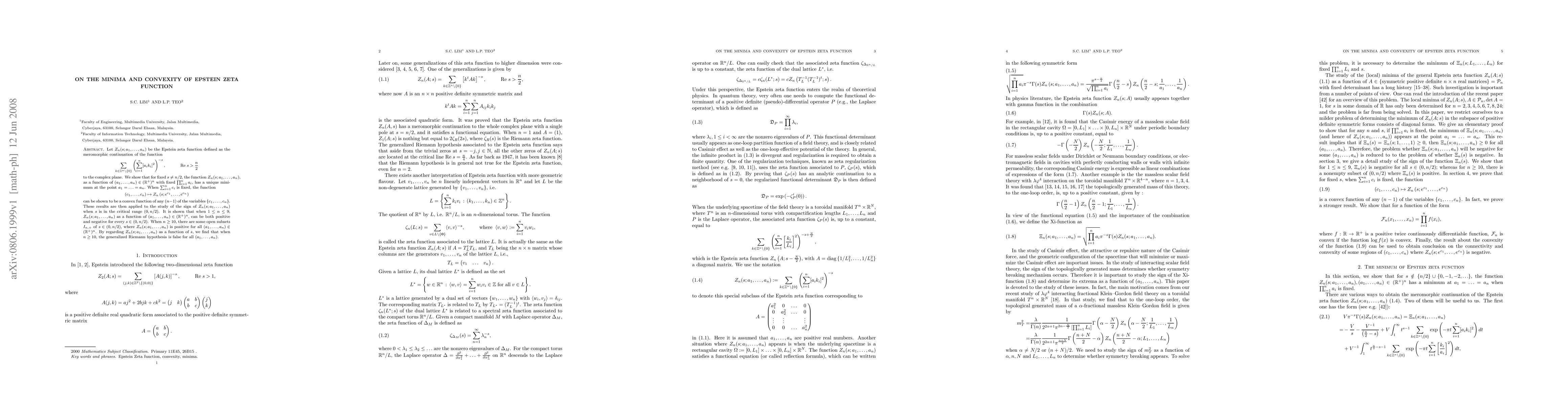 Let $Z_n(s; a_1,..., a_n)$ be the Epstein zeta function defined as the meromorphic continuation of the function \sum_{k\in\Z^n\setminus\{0\}}(\sum_{i=1}^n [a_i k_i]^2)^{-s}, \text{Re} s>\frac{n}{2} to the complex plane. We show that for fixed $s\neq n/2$, the function $Z_n(s; a_1,..., a_n)$, as a function of $(a_1,..., a_n)\in (\R^+)^n$ with fixed $\prod_{i=1}^n a_i$, has a unique minimum at the point $a_1=...=a_n$. When $\sum_{i=1}^n c_i$ is fixed, the function $$(c_1,..., c_n)\mapsto Z_n(s; e^{c_1},..., e^{c_n})$$ can be shown to be a convex function of any $(n-1)$ of the variables $\{c_1,...,c_n\}$. These results are then applied to the study of the sign of $Z_n(s; a_1,..., a_n)$ when $s$ is in the critical range $(0, n/2)$. It is shown that when $1\leq n\leq 9$, $Z_n(s; a_1,..., a_n)$ as a function of $(a_1,..., a_n)\in (\R^+)^n$, can be both positive and negative for every $s\in (0,n/2)$. When $n\geq 10$, there are some open subsets $I_{n,+}$ of $s\in(0,n/2)$, where $Z_{n}(s; a_1,..., a_n)$ is positive for all $(a_1,..., a_n)\in(\R^+)^n$. By regarding $Z_n(s; a_1,..., a_n)$ as a function of $s$, we find that when $n\geq 10$, the generalized Riemann hypothesis is false for all $(a_1,...,a_n)$.