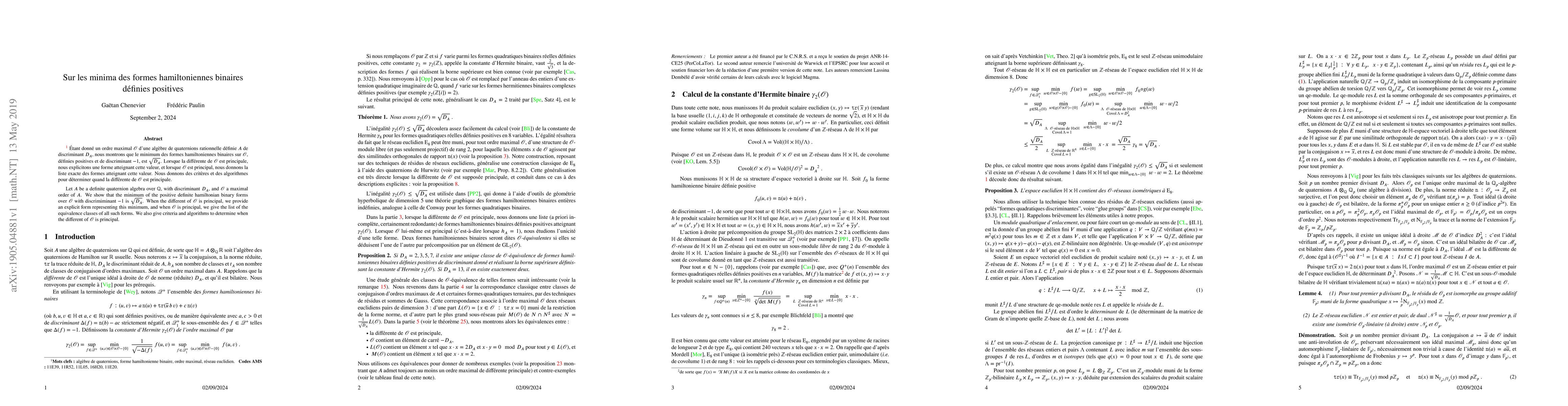 Let $A$ be a definite quaternion algebra over $\mathbb Q$, with discriminant $D_A$, and $O$ a maximal order of $A$. We show that the minimum of the positive definite hamiltonian binary forms over $O$ with discrimiminant $-1$ is $\sqrt{D_A}$. When the different of $O$ is principal, we provide an explicit form representing this minimum, and when $O$ is principal, we give the list of the equivalence classes of all such forms. We also give criteria and algorithms to determine when the different of $O$ is principal.