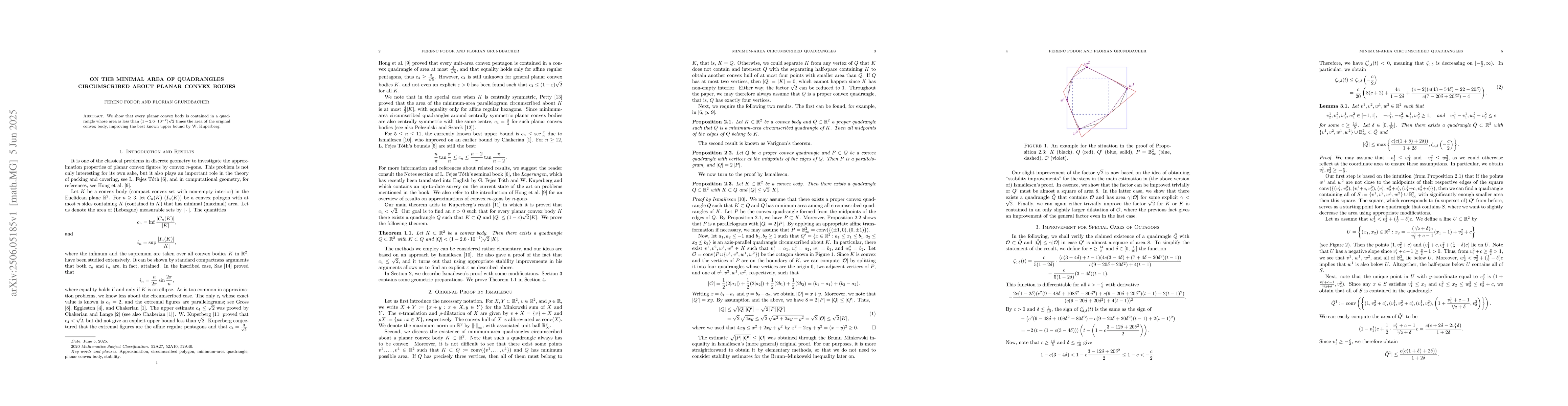 This research improves the upper bound for the minimal area of quadrangles circumscribed about planar convex bodies, showing that such a quadrangle's area is less than (1 - 2.6e-7)√2 times the area of the original convex body, surpassing the previous best result by W. Kuperberg.
