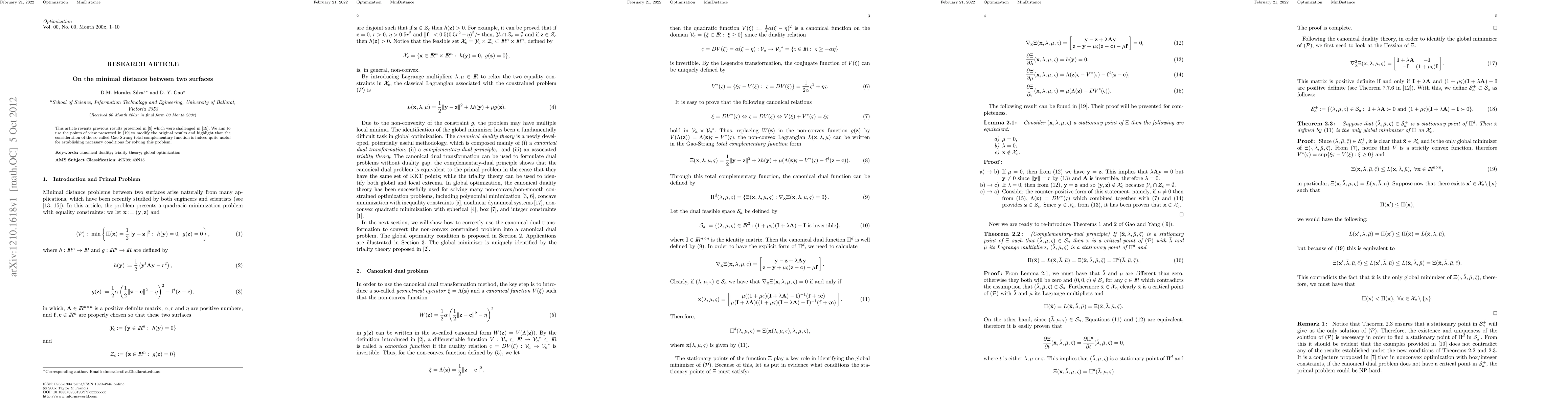 This paper addresses and modifies previous results from Optimization, resolving challenges posed by Voisei and Zalinescu (V-Z). It demonstrates the value of the Gao-Strang total complementary function in establishing necessary conditions for finding the minimal distance between two surfaces.
