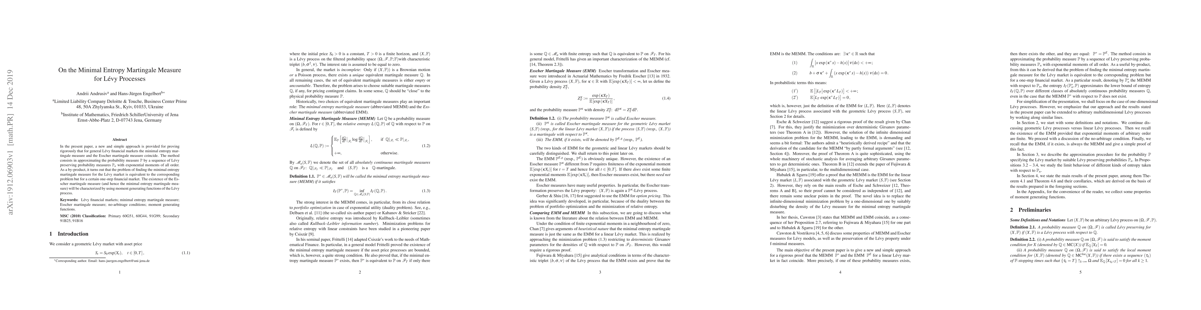 In the present paper, a new and simple approach is provided for proving rigorously that for general L\'evy financial markets the minimal entropy martingale measure and the Esscher martingale measure coincide. The method consists in approximating the probability measure P by a sequence of L\'evy preserving probability measures P_n with exponential moments of all order. As a by-product, it turns out that the problem of finding the minimal entropy martingale measure for the L\'evy market is equivalent to the corresponding problem but for a certain one-step financial market. The existence of the Esscher martingale measure (and hence the minimal entropy martingale measure) will be characterized by using moment generating functions of the L\'evy process. Keywords: L\'evy financial markets; minimal entropy martingale measure; Esscher martingale measure; no-arbitrage conditions; moment generating functions. MSC (2010) Classification: Primary 60G51, 60G44, 91G99; Secondary 91B25, 91B16