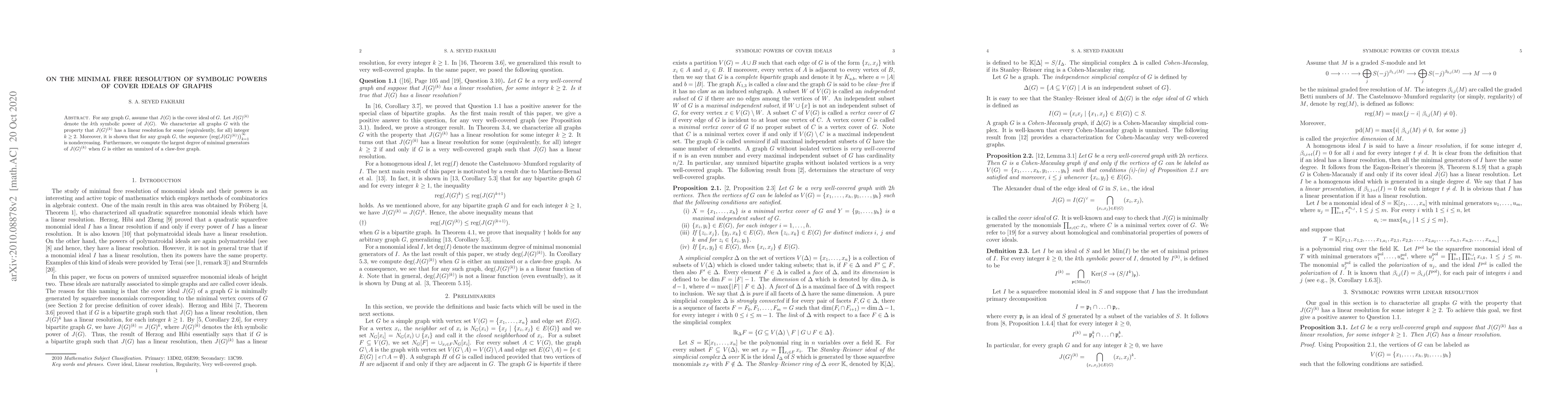This paper studies the minimal free resolution of symbolic powers of cover ideals of graphs, showing that linear resolution exists for some k for certain graph types and demonstrating a nondecreasing sequence of regularity values over all k.