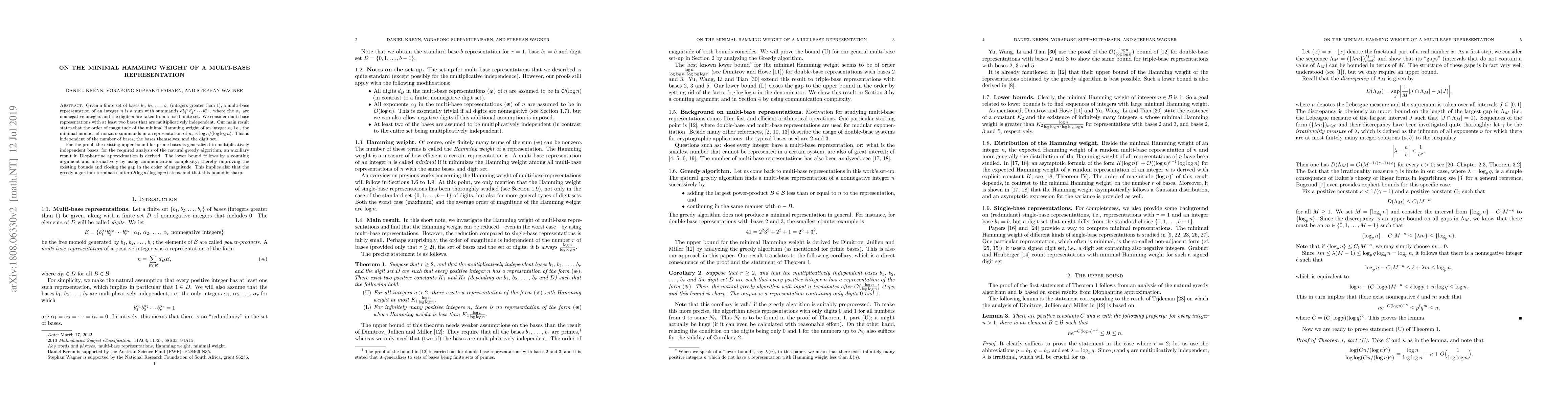 Given a finite set of bases $b_1$, $b_2$, \dots, $b_r$ (integers greater than $1$), a multi-base representation of an integer~$n$ is a sum with summands $db_1^{\alpha_1}b_2^{\alpha_2} \cdots b_r^{\alpha_r}$, where the $\alpha_j$ are nonnegative integers and the digits $d$ are taken from a fixed finite set. We consider multi-base representations with at least two bases that are multiplicatively independent. Our main result states that the order of magnitude of the minimal Hamming weight of an integer~$n$, i.e., the minimal number of nonzero summands in a representation of~$n$, is $\log n / (\log \log n)$. This is independent of the number of bases, the bases themselves, and the digit set. For the proof, the existing upper bound for prime bases is generalized to multiplicatively independent bases, for the required analysis of the natural greedy algorithm, an auxiliary result in Diophantine approximation is derived. The lower bound follows by a counting argument and alternatively by using communication complexity, thereby improving the existing bounds and closing the gap in the order of magnitude. This implies also that the greedy algorithm terminates after $\mathcal{O}(\log n/\log \log n)$ steps, and that this bound is sharp.