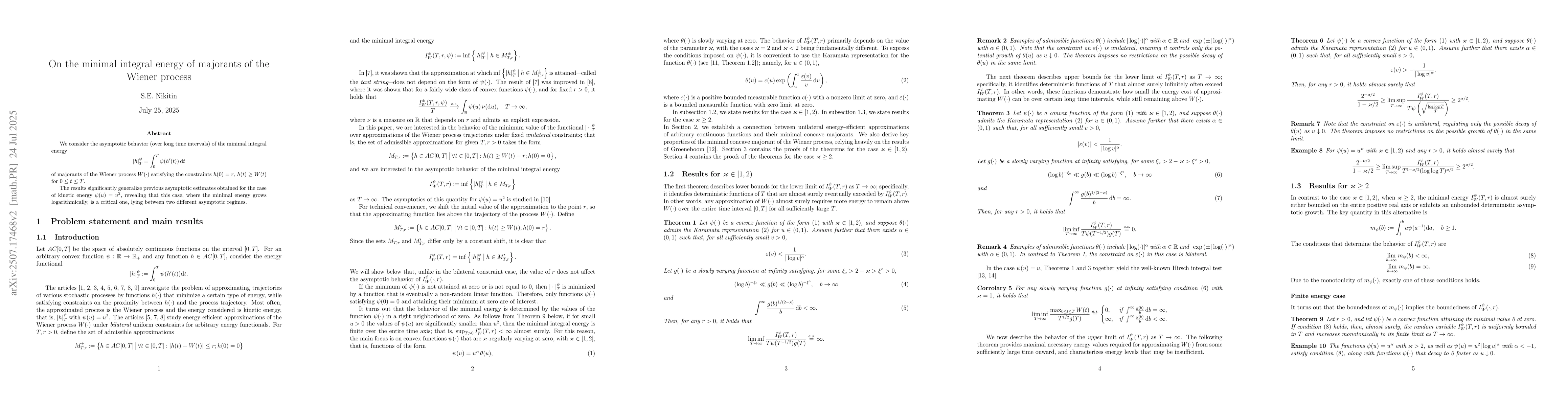 We consider the asymptotic behavior (over long time intervals) of the minimal integral energy \[ |h|_T^\psi = \int_0^T \psi(h^\prime(t)) \, \mathrm{d}t \] of majorants of the Wiener process $ W(\cdot) $ satisfying the constraints $ h(0) = r $, $ h(t) \geq W(t) $ for $ 0 \leq t \leq T $. The results significantly generalize previous asymptotic estimates obtained for the case of kinetic energy $ \psi(u) = u^2 $, revealing that this case, where the minimal energy grows logarithmically, is a critical one, lying between two different asymptotic regimes.