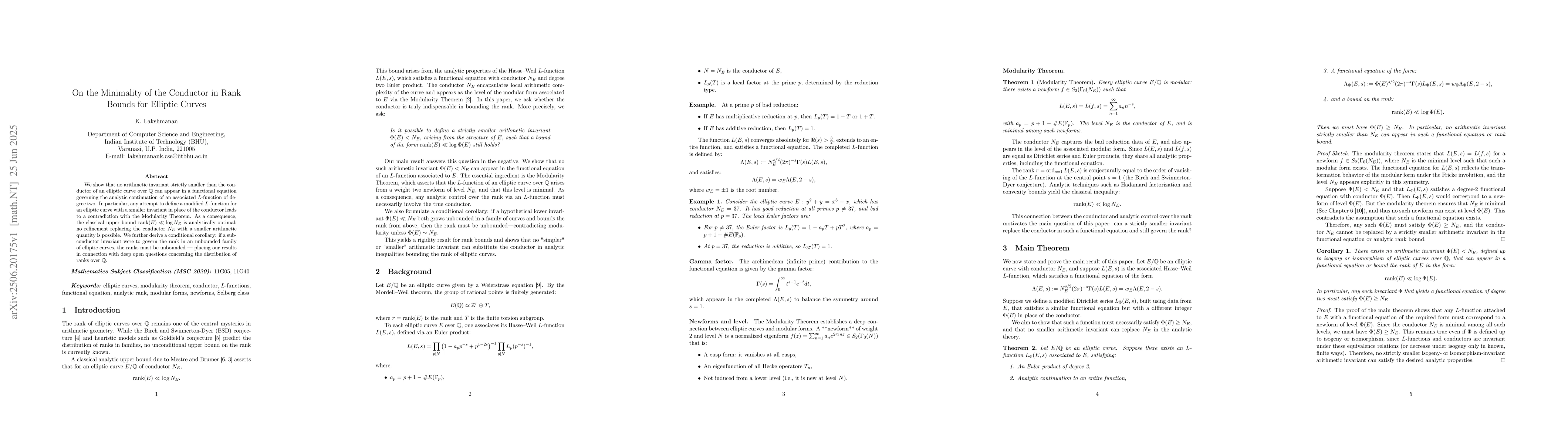 We show that no arithmetic invariant strictly smaller than the conductor of an elliptic curve over \( \mathbb{Q} \) can appear in a functional equation governing the analytic continuation of an associated \( L \)-function of degree two. In particular, any attempt to define a modified \( L \)-function for an elliptic curve with a smaller invariant in place of the conductor leads to a contradiction with the Modularity Theorem. As a consequence, the classical upper bound \( \operatorname{rank}(E) \ll \log N_E \) is analytically optimal: no refinement replacing the conductor \( N_E \) with a smaller arithmetic quantity is possible. We further derive a conditional corollary: if a sub-conductor invariant were to govern the rank in an unbounded family of elliptic curves, the ranks must be unbounded - placing our results in connection with deep open questions concerning the distribution of ranks over \( \mathbb{Q} \).