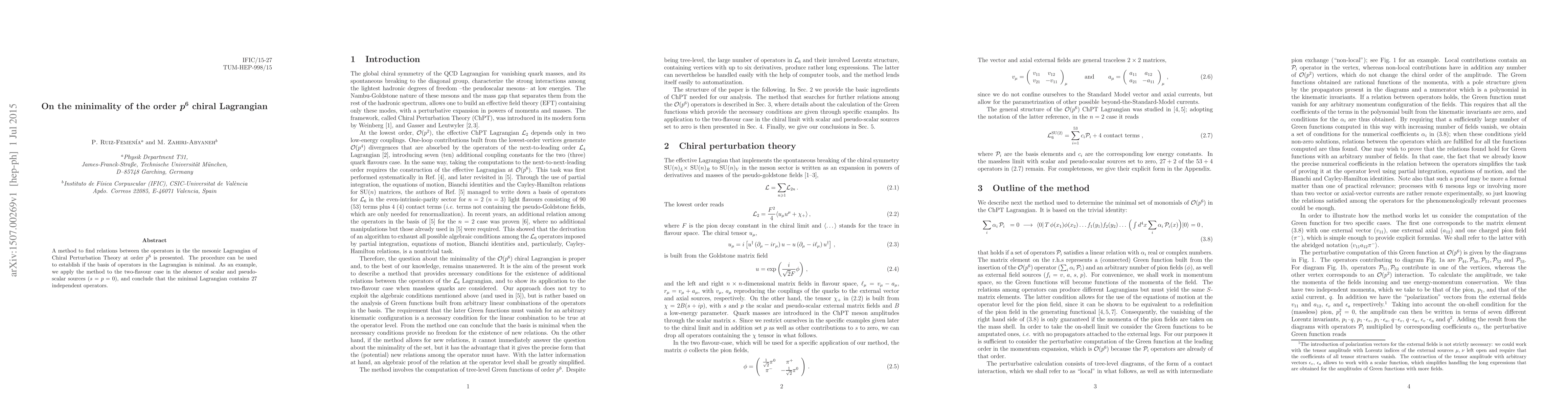 Researchers developed a method to determine the minimal set of operators in Chiral Perturbation Theory at order p^6, concluding that 27 independent operators are necessary for the two-flavour case without scalar or pseudo-scalar sources.